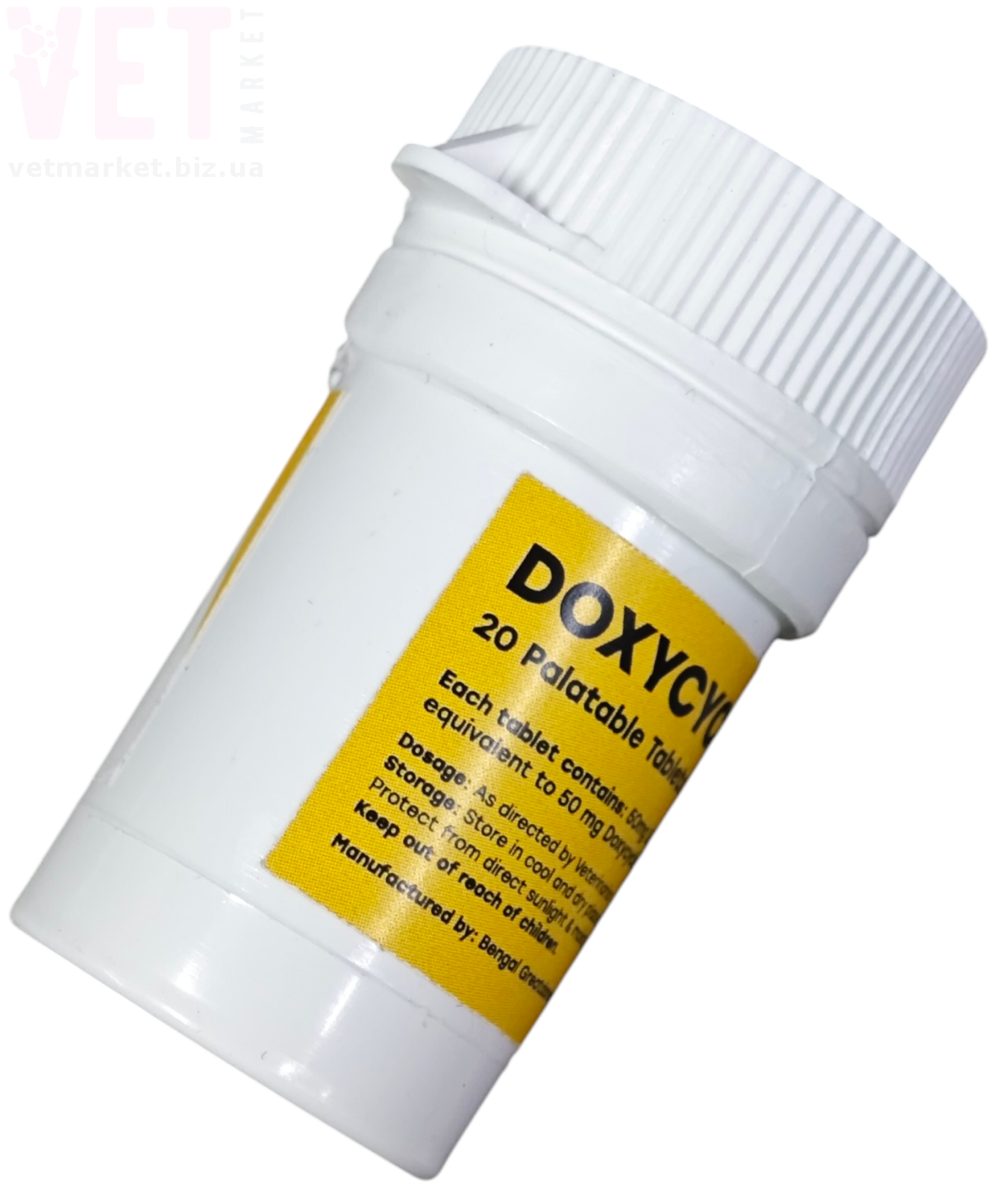 Фармакокінетика: Приблизно 95% доксицикліну повністю абсорбується після прийому внутрішньо і, завдяки високому рівню жиророзчинності, він проникає у більшість рідин та органічних тканин. Добре зв'язується з білком плазми порівняно з іншими тетрациклінами, що призводить до пролонгованого періоду напіввиведення у людей та тварин. Доксициклін виводиться з калом, не через жовчовивідні шляхи, у неактивній формі. Виведення з організму буде тривалішим, через стійкий рівень сироватки. На відміну від інших антимікробних препаратів свого класу наявність їжі в кишечнику не впливає на абсорбцію доксицикліну, тому рекомендовано тваринам з почечною недостатністю, коли інші тетрацикліни протипоказані.