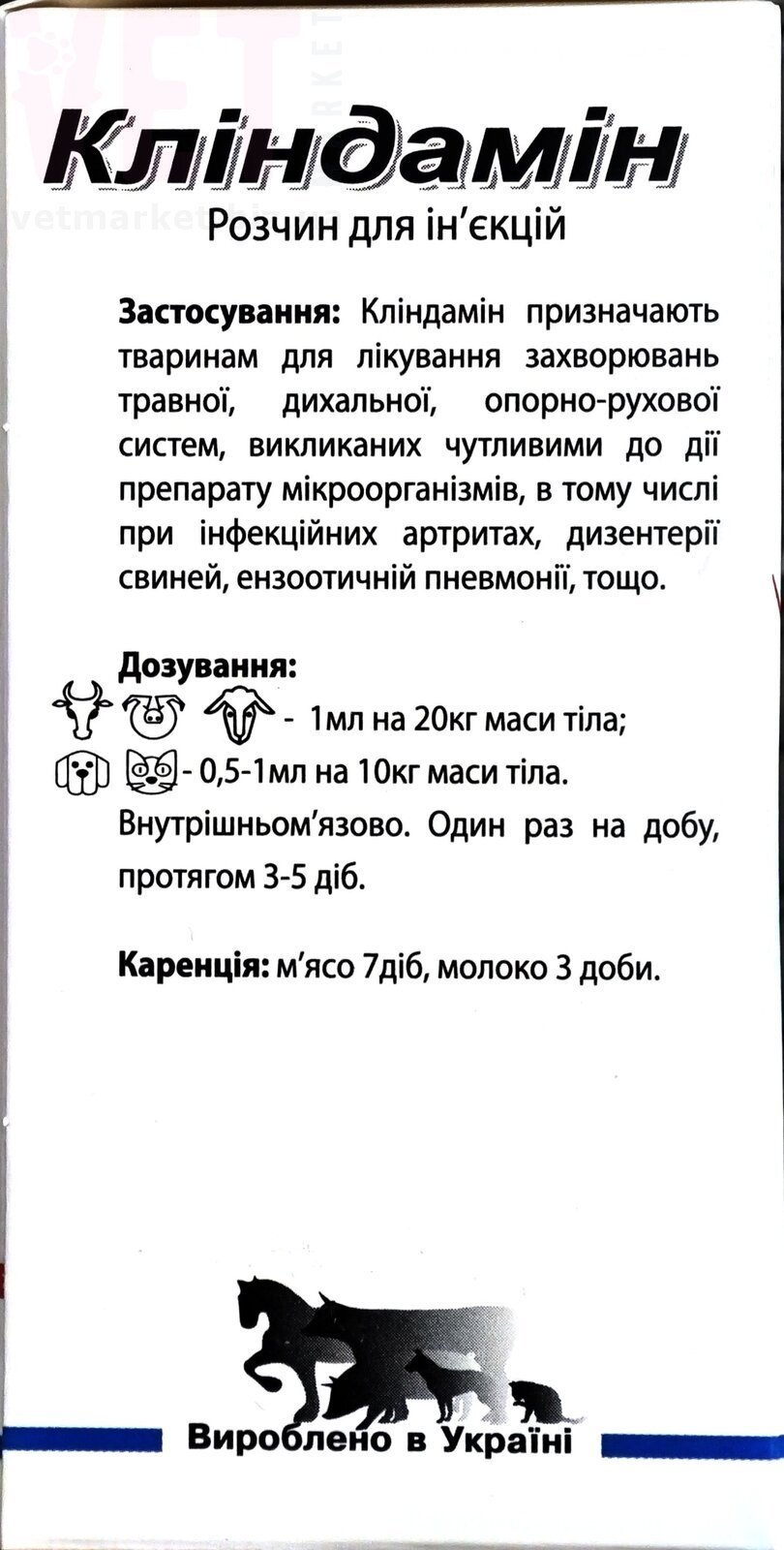 Застосування:Кліндамін призначають молодняку великої та дрібної рогатої худоби, свиням, собакам і кішкам для лікування захворювань травної, дихальної, опорно-рухової систем, викликаних чутливими до дії препарату мікроорганізмами, в тому числі при інфекційних артритах, дизентерії свиней, ензоотичній пневмонії, тощо.