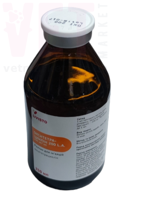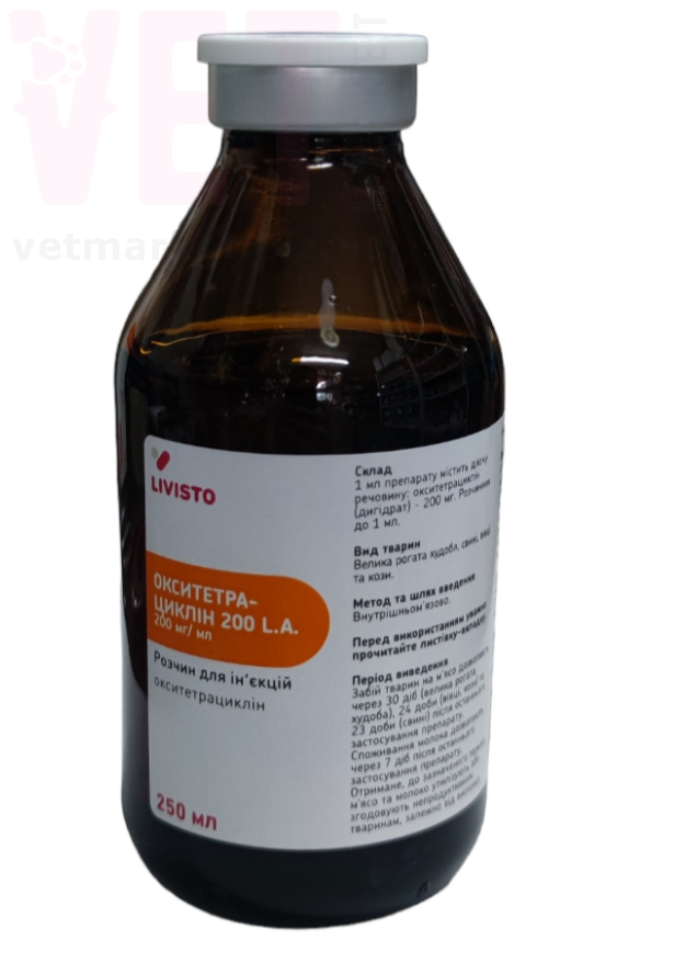 КоличествоОкситетрациклин 200 L.A. (1 флакон 250 мл) - высокоэффективный современный антибиотик широкого спектра действия, применяют для лечения бронхопневмонии, колибактериоза, сальмонеллеза и других заболеваний свиней, крупного рогатого скота, овец и коз, вызванных микроорганизмами, чувствительными к окситетрациклину.