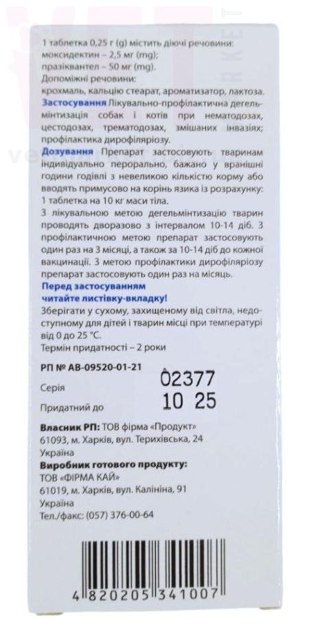 Комбинация действующих веществ, входящих в состав препарата, обеспечивает широкий спектр антигельминтного действия в отношении личиночных и половозрелых форм кишечных нематод (Toxocara canis, Toxocara cati, Toxascaris leonina, Ancylostoma caninum, Ancylostoma tubaeforme, Uncinaria stenocephala, Trichuris vulpis), личиночных форм легочных нематод Angiostrongylus vasorum, Crenosoma vulpis, личиночных форм (микродирофилярий) нематод Dirofilaria immitis; цестод (Taenia spp., Dipylidum caninum, Mesocestoides spp., Echinococcus granulosis та Echinococcus multilocularis).