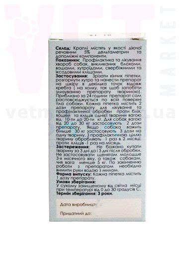 Состав: Капли содержат в качестве действующего вещества 5% дельтаметрина и вспомогательные компоненты.