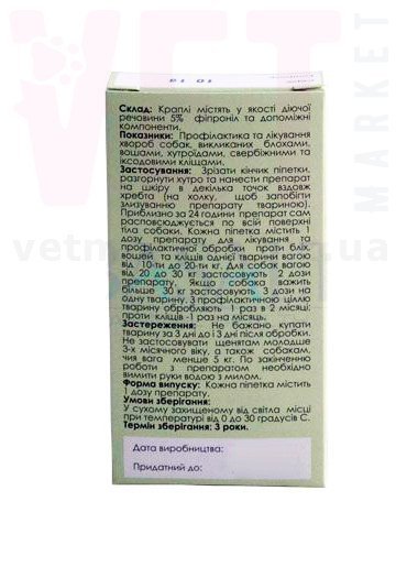 Фармакологические свойства: Фипронил входящий в состав препарата, обладает выраженным инсектицидным и акарицидным действием в отношении блох, вшей, власоедов, иксодовых и чесоточных клещей, паразитирующих на собаках. Препарат при накожном нанесении накапливается в эпидермисе и сальных железах животного и оказывает контактное инсекто-акарицидное действие на эктопаразитов, обеспечивая защиту животных от насекомых и клещей в течении 1-2 месяцев после однократного применения.