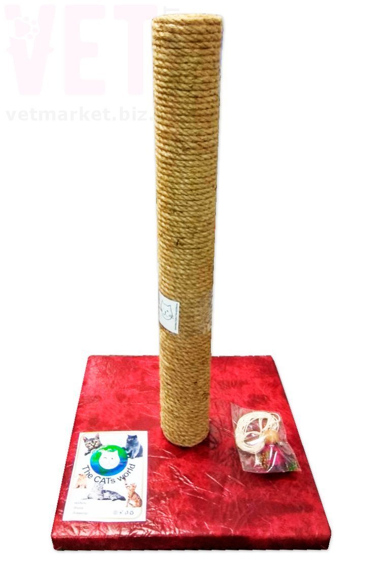 Когтеточка напольная с квадратным основанием. Представляет собой подставку покрытую мягкой тканью, на которой укреплен столбик. К когтеточке в комплекте идет игрушка на веревке из экологически чистых и природных материалов. Столбик обтянут джутовой веревкой, чтобы кошка могла точить когти вертикально. Когти у кошек растут всю жизнь, поэтому их необходимо стачивать, такой предмет как когтеточка поможет решить эту проблему.