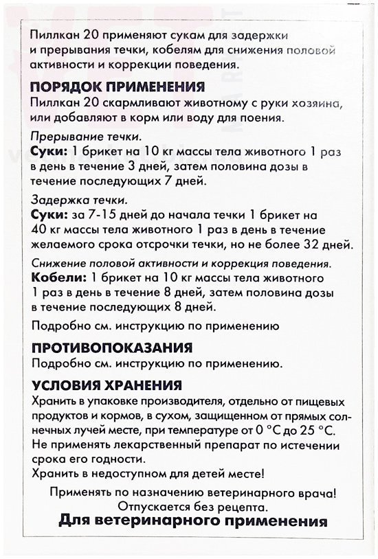 Для задержки течки применять 1 кубик Пиллкана 5 вне периода течки или беременности каждые 2 недели настолько долго, насколько желательно отсрочить течку. Течка начнётся через несколько дней после прекращения дачи препарата.