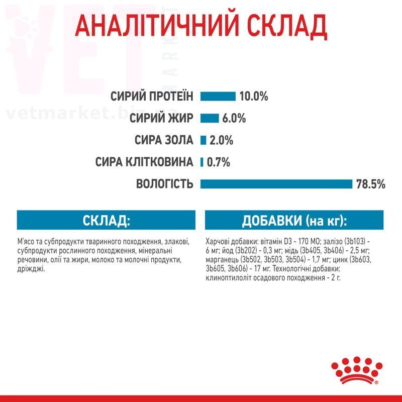 Склад: м’ясо та субпродукти тваринного походження, злакові, субпродукти рослинного походження, мінеральні речовини, олії та жири, молоко та молочні продукти, дріжджі.