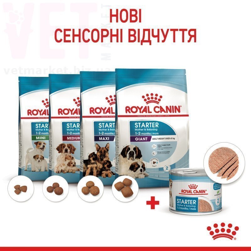 Чи годують дитину так само я і дорослу людину? Очевидно, що ні. Діти мають чутливу травну систему, маленькі щелепи, у них немає зубів, тому вони, наприклад, не можуть відкусити яблуко. Ці факти полегшують розуміння того, чому цуценятам також потрібен не такий корм, як дорослим собакам. Раціон у період росту відіграє ключову роль у майбутній морфології та здоров’ї цуценяти. Вологий раціон Royal Canin Mother & Babydog розроблений для вагітних сук та новонародженних цуценят порід всіх розмірів віком до 2 місяців.