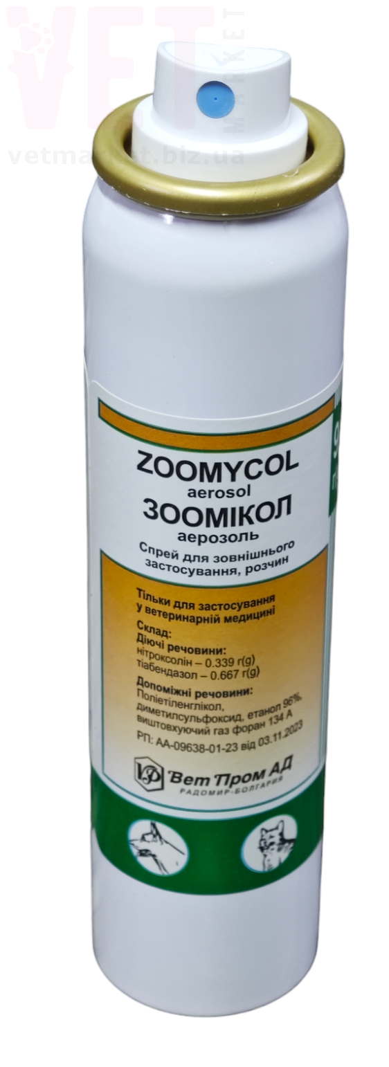 Зоомікол, флакон 90 г, призначають для лікування шкірних грибкових захворювань сільськогосподарських та дрібних свійських тварин, а також птахів.