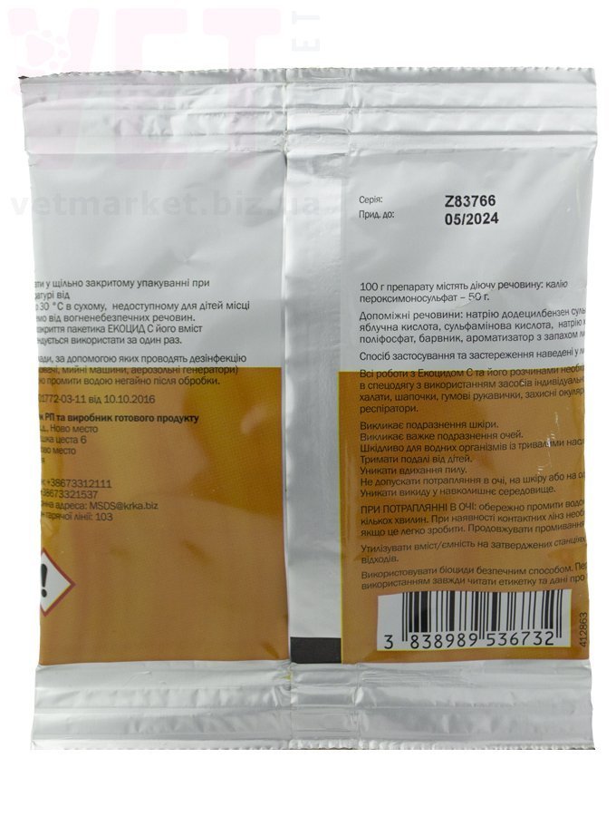 Экоцид С (Ecocid C), 50 г - высокоактивное дезинфицирующее средство для безопасной и эффективной защиты от многих известных вирусов. Также имеет бактерицидное и фунгицидное действие. Применяется для дезинфекции животноводческих и птицеводческих помещений, систем подачи питьевой воды, цехов по переработке птицы и яиц, забойных и мясоперерабатывающих цехов, транспортных средств, оборудования, поверхностей, приборов, инструментария, санитарно-технического оборудования и других объектов, подлежащих ветеринарному надзору.