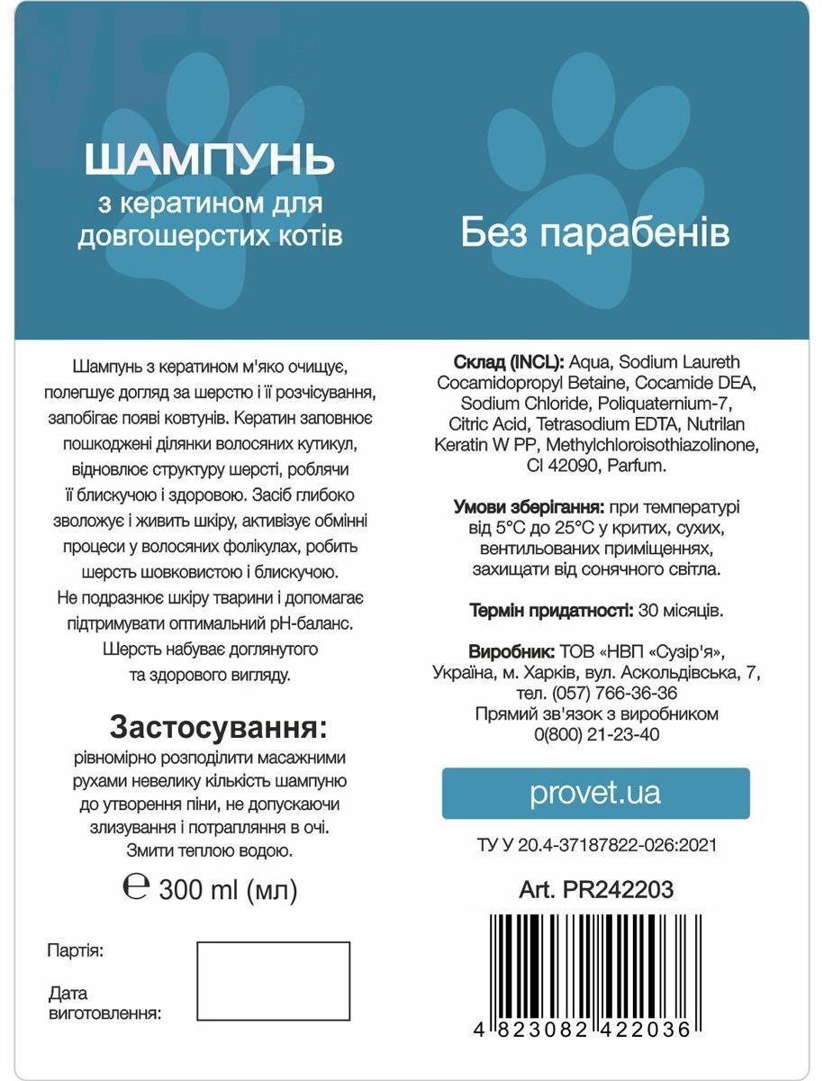 Профілайн шампунь з кератином для довгошерстих котів, 300 мл, ProVET