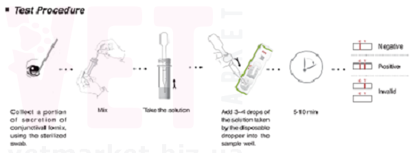 СБОР И ХРАНЕНИЕ ОБРАЗЦОВ Образцом для проведения теста являются глазные выделения (конъюктива) котов. Взятые образцы должны быть протестированы как можно скорее. При необходимости они могут храниться при 2-30°С до 48 часов. Если требуется более длительное хранение, то образец может быть заморожен при температуре - 20 °C. 2. Извлеките тестовое устройство из герметичного пакета и поместите его на ровную и чистую поверхность. 3. Ватной палочкой проведите забор секрета слизи глаз или выделенный из носа животного. 4. Окуните ватную палочку в пробирку с буферным раствором для анализа, пока образец не растворится . , в лунку для образца (S). 15-20 минут интерпретируйте результат(ы) теста. Результаты после 30 минут не являются действительными . Результаты теста считаются действительными вне зависимости от интенсивности окрашивания полосы (Т) в окне результатов ! в тестовой зоне ( С). Первичная скрининговая диагностика антигенов герпевируса (ринотрахеита) котов. должен основываться на одном результате теста. СПЕЦИФИКАЦИЯ ТЕСТА Чувствительность: FHV Ag – 95.4% по сравнению с РCR