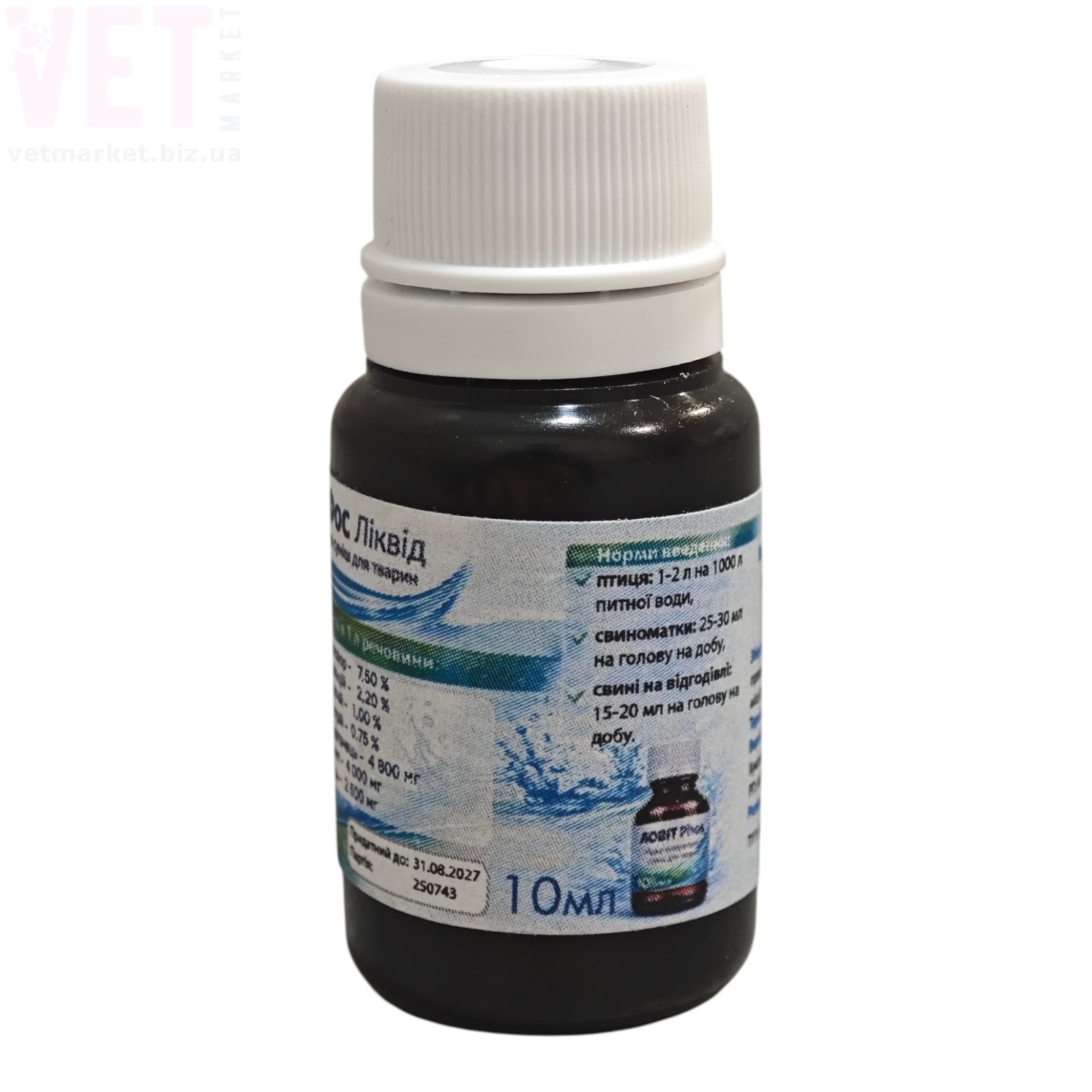 Спосіб застосування: 1–2 мл на 1 л питної води курсом 3–5 днів. У продажу флакони 10 мл та 100 мл.