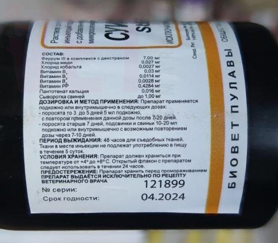 Суиферровит, 100 мл - инактивированная сыворотка для свиней в виде раствора для инъекций.