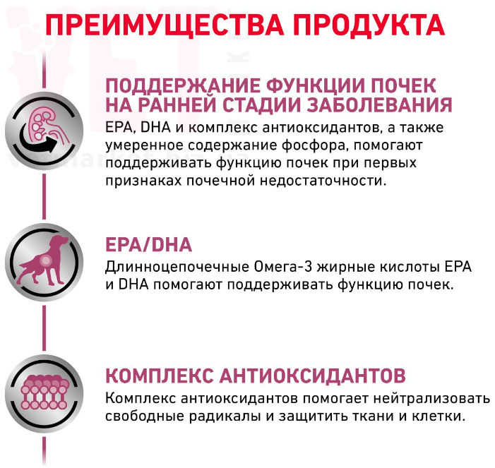 Омега-3 жирные кислоты EPA, DHA и комплекс антиоксидантов, а также умеренное содержание фосфора помогают поддерживать функцию почек при первых признаках недостаточности.