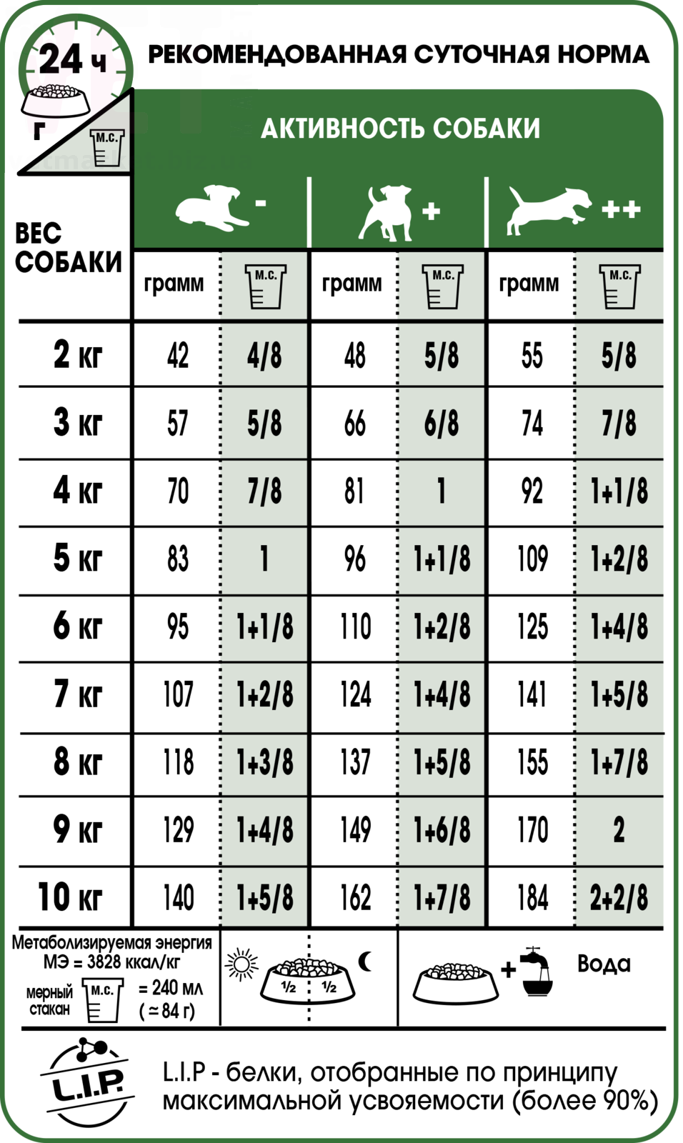 См. таблицу. Корм готов к употреблению. Проследите, чтобы у вашей собаки всегда была свежая вода. Номер серии, регистрационный номер и срок годности указаны на упаковке. Хранить в сухом, прохладном месте.