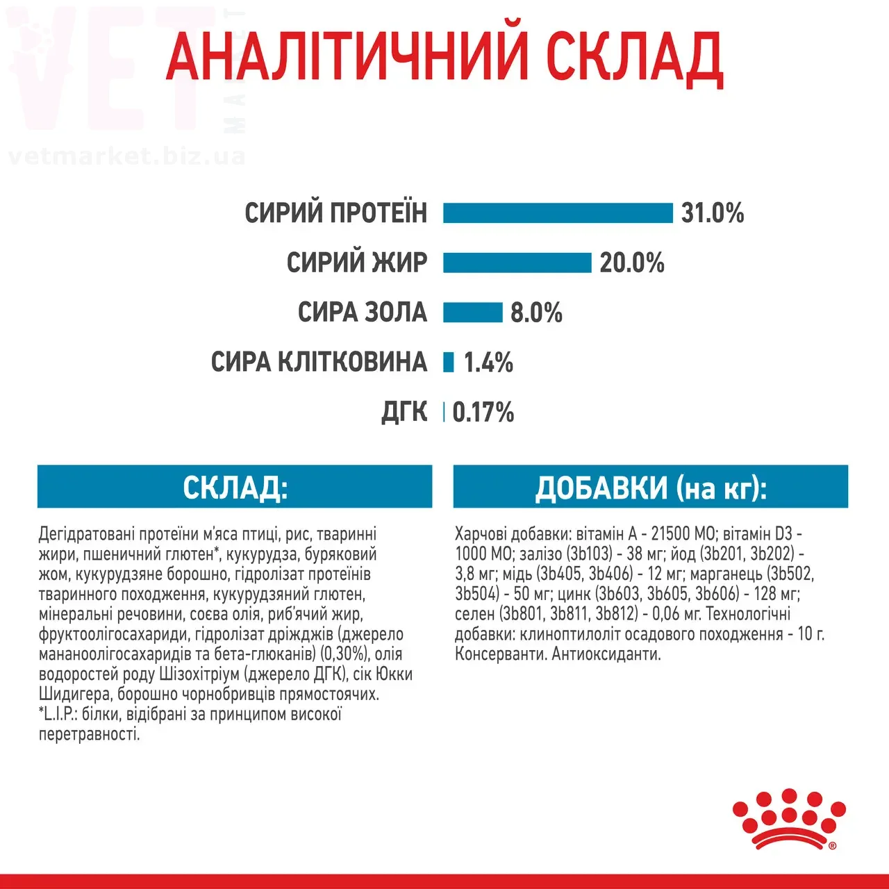 дегідратовані протеїни м’яса птиці, рис, тваринні жири, пшеничний глютен*, кукурудза, буряковий жом, кукурудзяне борошно, гідролізат протеїнів тваринного походження, кукурудзяний глютен, мінеральні речовини, соєва олія, риб’ячий жир, фруктоолiгосахариди, гідролізат дріжджів (джерело мананоолігосахаридів та бета-глюканів) (0,30%), олія водоростей роду Шізохітріум (джерело ДГК).