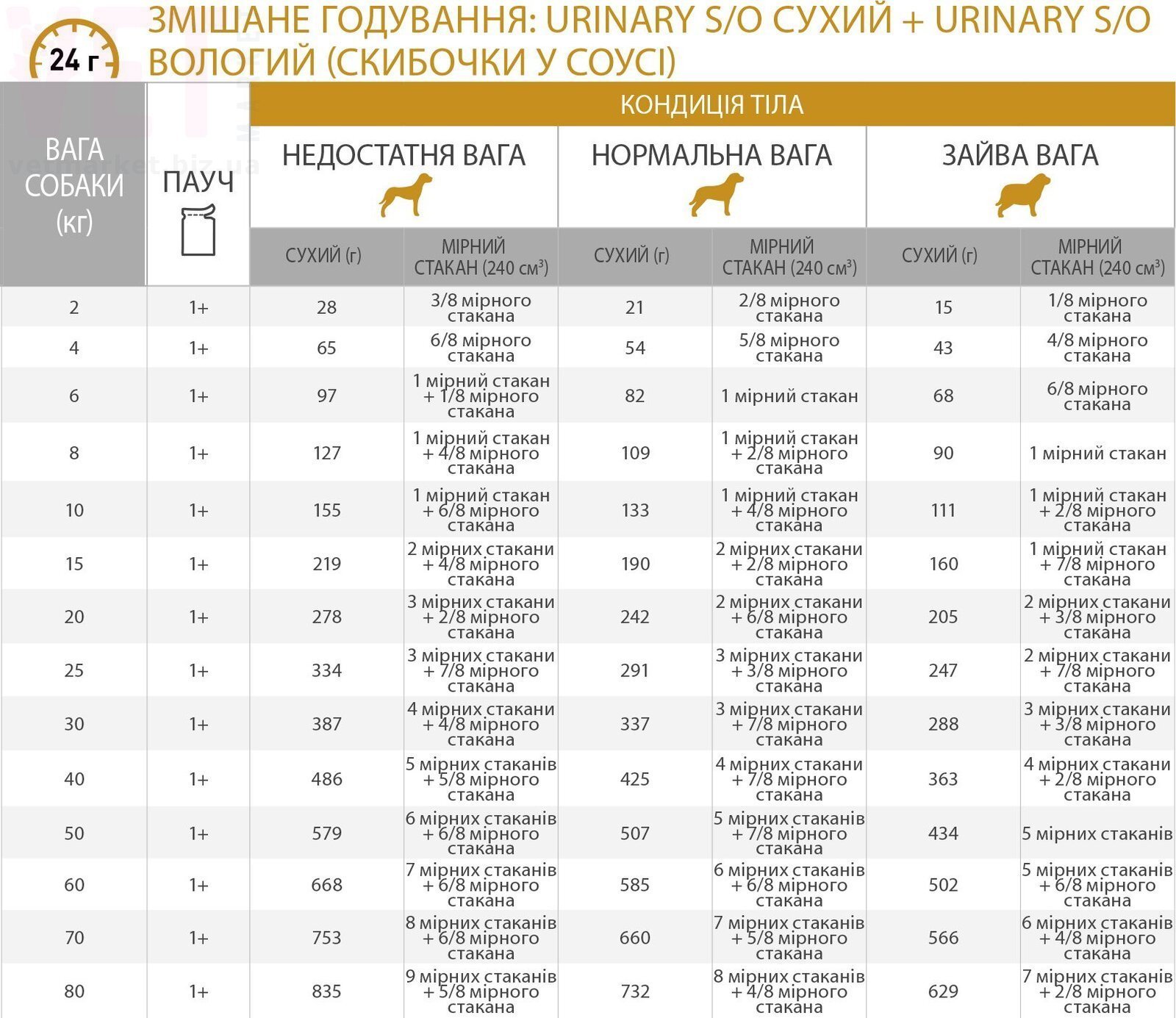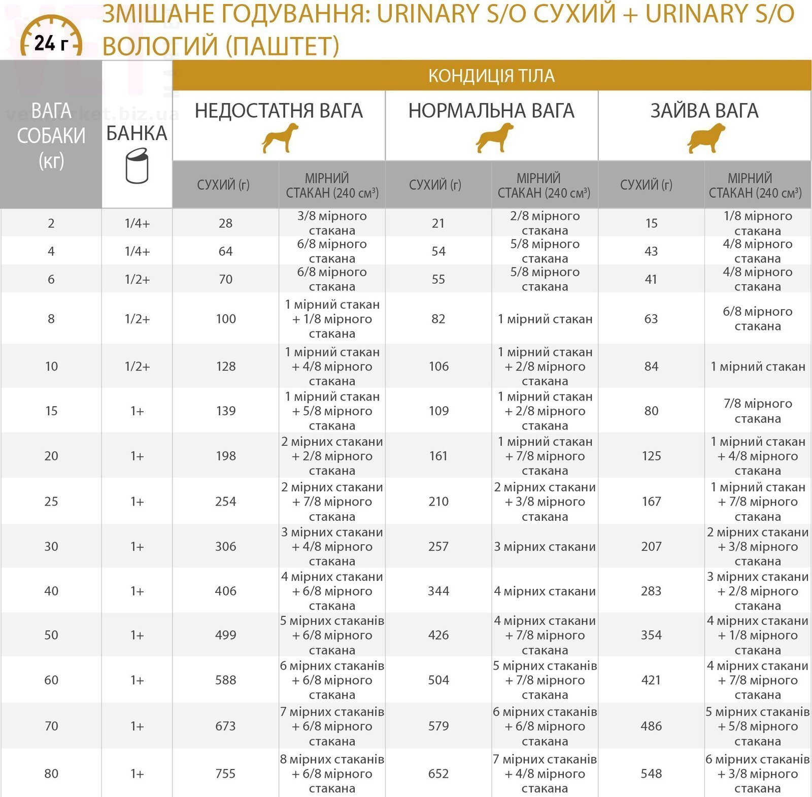 Перед початком споживання слід проконсультуватися з ветеринарним лікарем. Годування кормом Urinary S/O від 5 до 12 тижнів для розчинення струвітних каменів. Для попередження рецидивів уролітіазу курс лікування слід продовжувати ще не менше 6 місяців, при цьому необхідно регулярне проведення аналізів сечі. Після одужання рекомендується регулярний огляд у ветеринарного лікаря, за необхідності корм може бути призначений упродовж всього життя. Пам’ятайте, що тварині слід забезпечити постійний доступ до питної води.