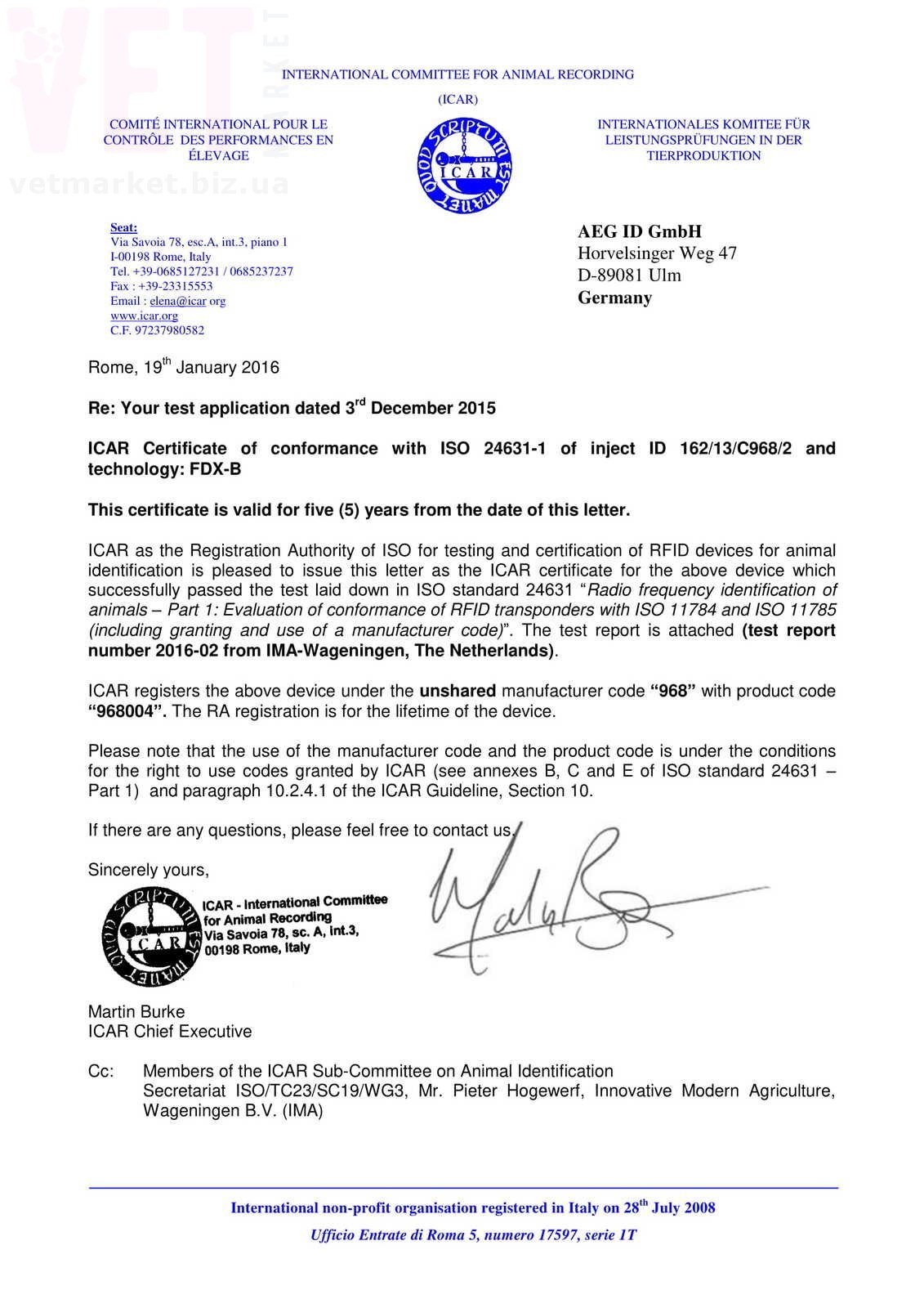 Код производителя "AEG GmbH" 968, выданный Международным регистрационным комитетом, ICAR гарантирует уникальность ID номера микрочипа и его соответствие международному стандарту ISO 11784/5 . Корпус микрочипа изготовлен из биосовместимого стекла Shott с характерным зеленым оттенком, который гарантированно защищает электронные части от влажности, тепла, вибраций и загрязнения, а также исключает отторжение организмом животного.