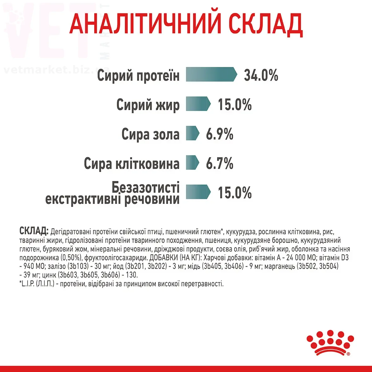 дегідратовані протеїни свійської птиці, пшеничний глютен* , кукурудза, рослинна клітковина, рис, тваринні жири, гідролізовані протеїни тваринного походження, пшениця, кукурудзяне борошно, кукурудзяний глютен, буряковий жом, мінеральні речовини, дріжджові продукти, соєва олія, риб’ячий жир, оболонка та насіння подорожника (0,50%), фруктоолiгосахариди.