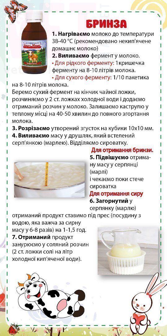 Використання: при виробництві сиру, молоко з температурою (32°С - 38°С) з розрахунку на 8-10л молока вносять одну кришку (6-7 мл) рідкого ферменту. Вироблено та розфасовано у Турції.