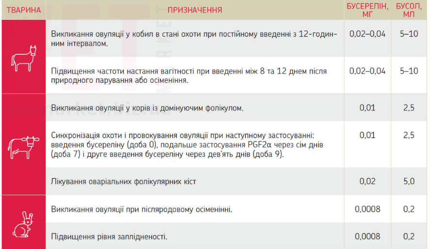 Доза на тварину становить 10-20 мкг бусерелина для врх і свиней, 20-40 мкг для кобил і 0,8 мкг для кроликів.Протипоказання: