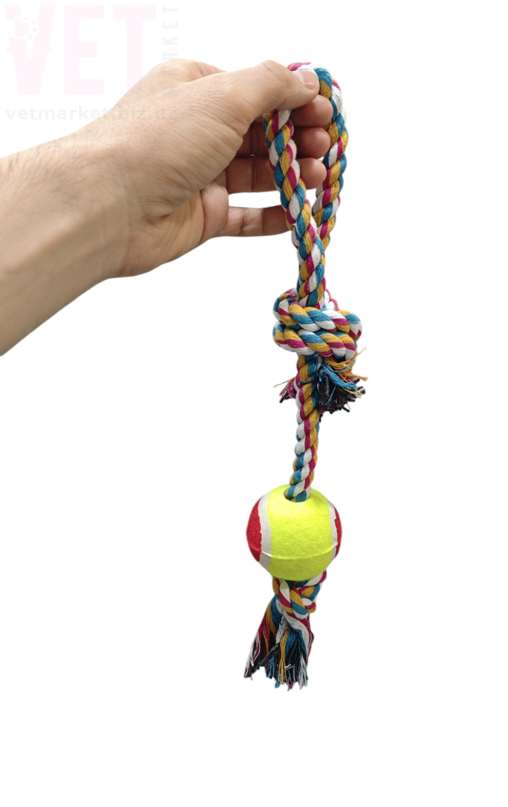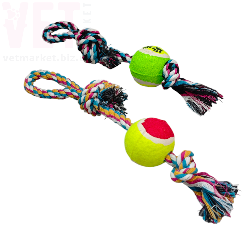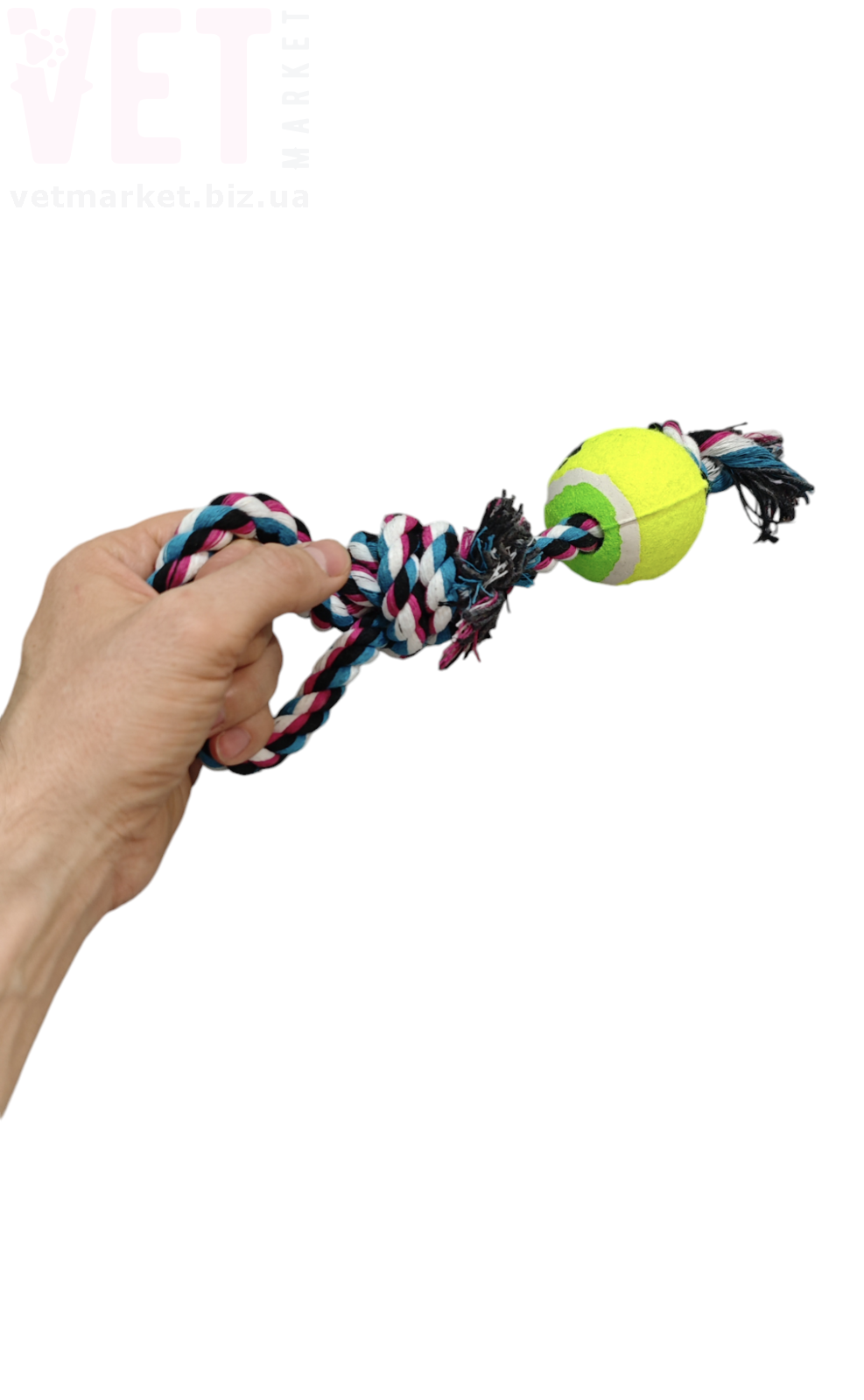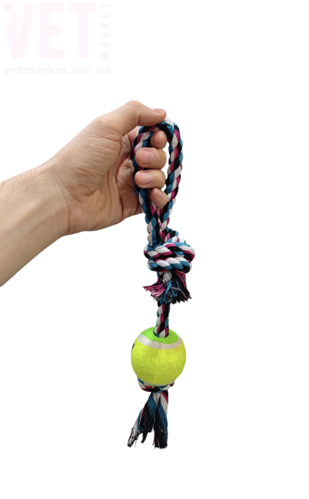 Игрушка канат грейфер с мячом для собак и щенков. Хлопковая жевательная веревка обеспечивает чистку зубов, массирует десна и используется для обучения, игр, теннисный мячик на веревке принесет двойное удовольствие домашнему питомцу.