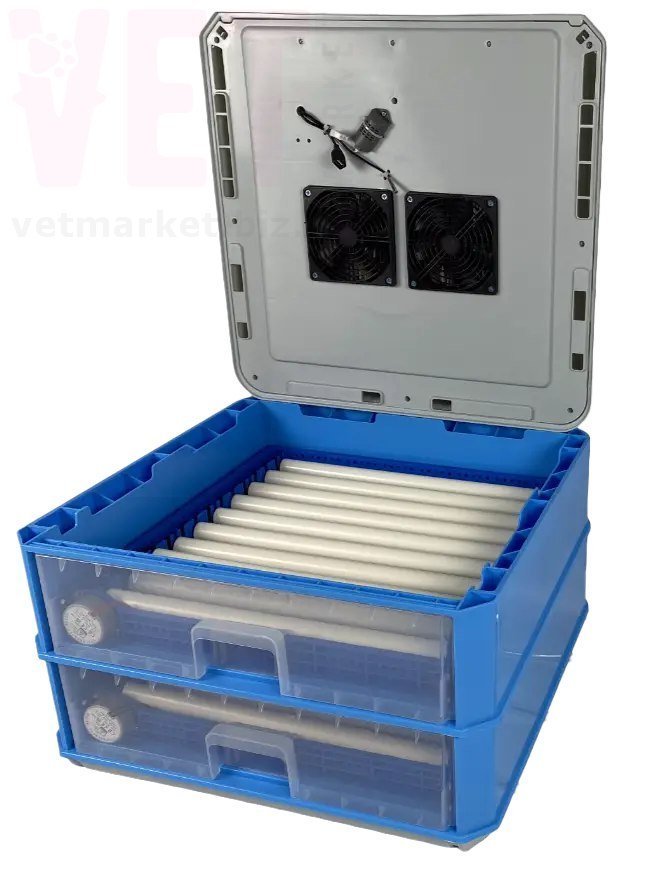 Для принудительной циркуляции воздуха и распределения тепла в крышку встроено 2 вентилятора. Инкубатор упаковывается в короб из плотного спрессованного пенопласта. Его можно использовать в процессе инкубации, дополнительно уменьшая теплопотери.