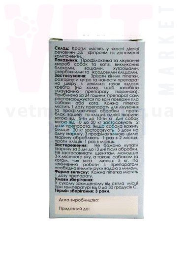 Фармакологические свойства: Фипронил входящий в состав препарата, обладает выраженным инсектицидным и акарицидным действием в отношении блох, вшей, власоедов, иксодовых и чесоточных клещей, паразитирующих на собаках. Препарат при накожном нанесении накапливается в эпидермисе и сальных железах животного и оказывает контактное инсекто-акарицидное действие на эктопаразитов, обеспечивая защиту животных от насекомых и клещей в течении 1-2 месяцев после однократного применения.