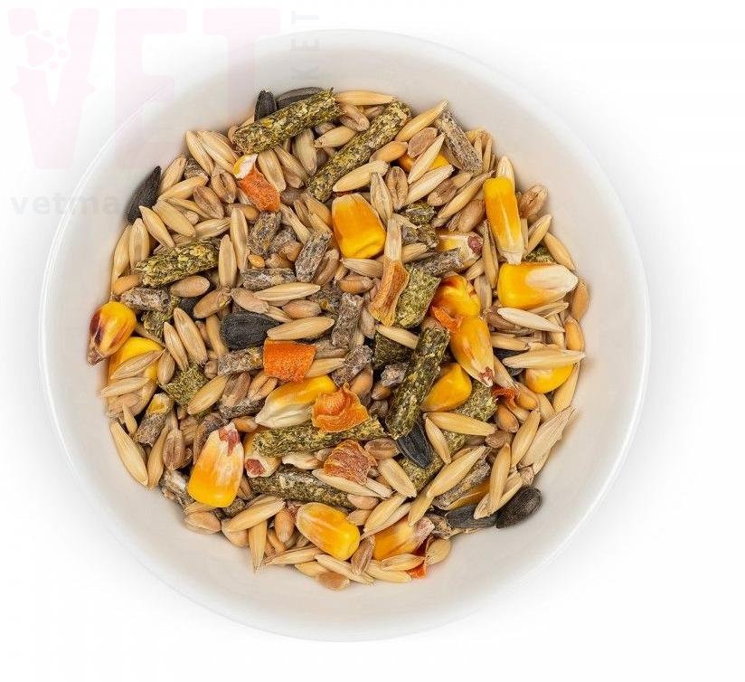 Склад: пшениця, трав’яне борошно гранульоване в асортименті, кукурудза, овес, комбікорм, сушена морква, насіння соняшнику, яблука сушені гранульовані.
