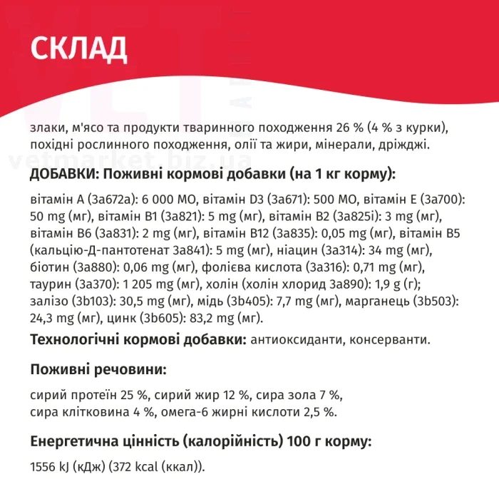 Витамин А (3a672a): 6000 МЕ, витамин D3 (3a671): 500 МЕ, витамин Е (3a700): 50 мг (мг), витамин В 1 (3a821): 5,0 mg (мг), витамин В2 (рибофлавин): 3, (3a841): 5,0 mg (мг), ниацин (3a314): 34 mg (мг), витамин В6 (3a831): 2,0 мг (мг), фолиевая кислота (3a316): 0,71 mg (мг), витамин В 12 (цианокобала (3a880): 0,051 мг (мг), таурин (3a370): 1205 мг (мг); микроэлементы: сульфат мед пентагидрат (3b405): 30,3 mg (мг), цинк сульфат гептагидрат (3b604): 373,1 mg (мг), сульфат марц (3b503): 83,2 мг (мг).