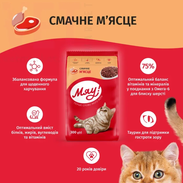 Хрустящие гранулы с насыщенным вкусом мясо понравятся даже самым привередливым питомцам, а тщательно подобранный состав обеспечивает ежедневное полноценное питание. В рецептуре присутствуют продукты животного происхождения, злаки, экстракты растительного белка, минералы, масла и жиры.