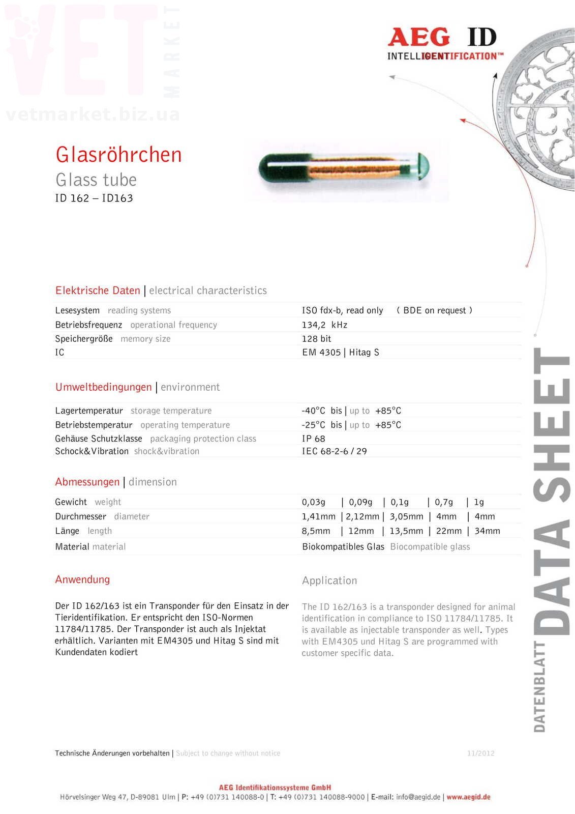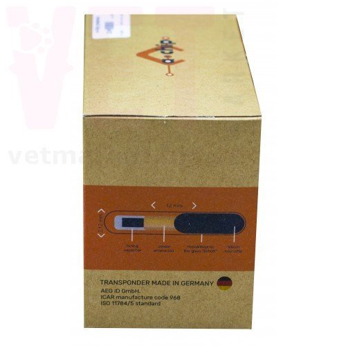 Код производителя "AEG GmbH" 968, выданный Международным регистрационным комитетом, ICAR гарантирует уникальность ID номера микрочипа и его соответствие международному стандарту ISO 11784/5 . Корпус микрочипа изготовлен из биосовместимого стекла Shott с характерным зеленым оттенком, который гарантированно защищает электронные части от влажности, тепла, вибраций и загрязнения, а также исключает отторжение организмом животного.
