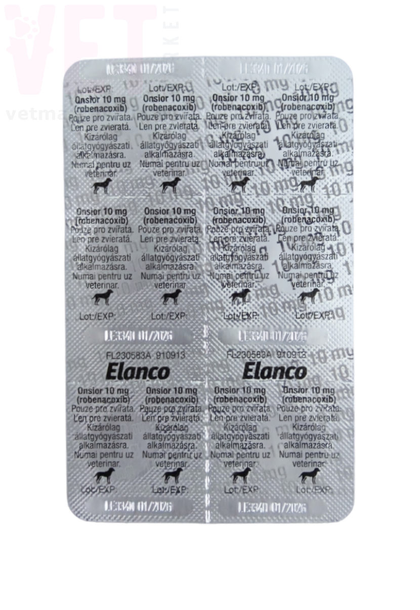 Робенакоксиб, входящий в состав препарата, – нестероидное противовоспалительное средство группы коксибов, является селективным специфическим ингибитором ЦОГ-2 и обладает противовоспалительным и анальгезирующим действием. ЦОГ представлена в двух формах: ЦОГ-1 – конститутивная форма энзима – выполняет защитные функции, в том числе в желудочно-кишечном тракте и почках; ЦОГ-2 — индуцируемая форма энзима – отвечает за выработку медиаторов, включающих ПГЕг, вызывающих боль, воспаление и жар. При пероральном введении робенакоксиб быстро всасывается в кишечнике, поступая в системный кровоток и большинство органов и тканей; более 99% робенакоксиба связывается с белками плазмы. Его максимальная концентрация в плазме отмечается через 0,5 часа, биодоступность составляет 49% у кошек и 62% у собак при применении таблеток с кормом и 84% без корма. Метаболизируется робенакоксиб в печени, выделяется в основном с желчью (около 70% у кошек и около 65% у собак) и частично – с мочой; период полувыведения из организма собак составляет около 1,2 часа, кошек – 1,7 часа. Онсиор™ таблетки по степени воздействия на организм относится к умеренно опасным веществам (3 класс опасности по ГОСТ 12.1.007).