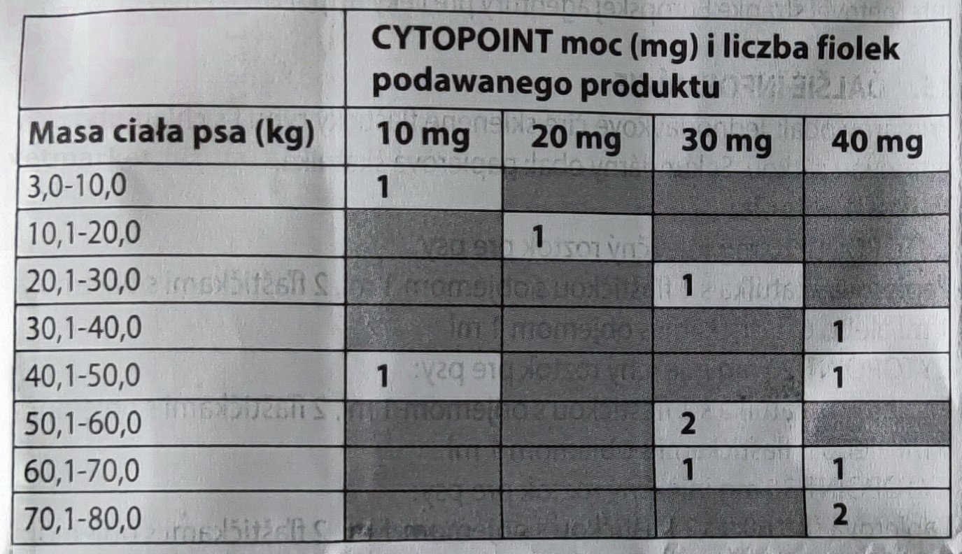 Цитопоінт випускається у флаконах об'ємом 1 мл у чотирьох концентраціях (10, 20, 30 або 40 мг). Введіть цитопінту в мінімальній дозі 0,9 мг / фунт (2 мг / кг) ваги тіла. Для зручності наведені нижче таблиці дозування можна використовувати як посібник. При необхідності повторюйте кожні 4-8 тижнів окремим пацієнтам.