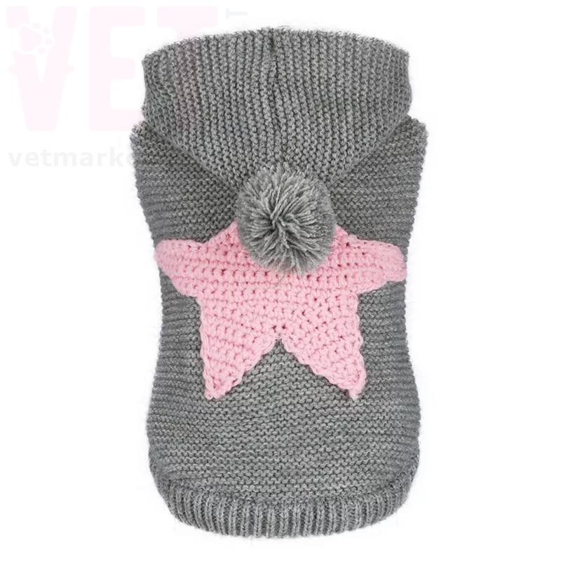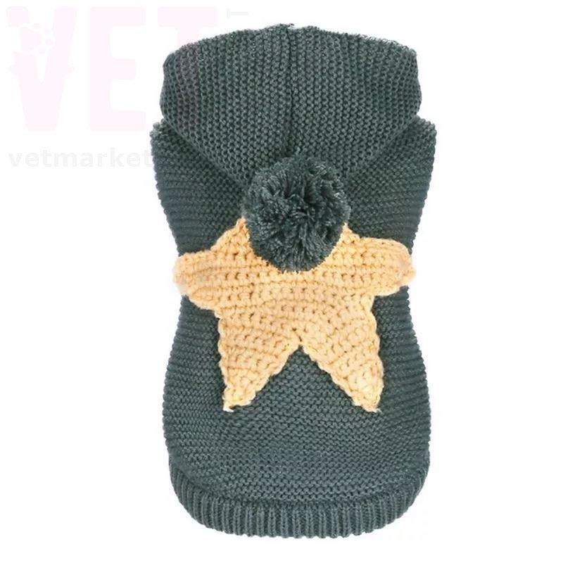 Наш веселенький свитерок согреет вашего питомца в холодное время года. Свитер выполнен из акрила и шерсти. На спинке объемная аппликация в виде звезды. Низ изделия окантован широкой резинкой, что позволит свитерочку более плотно облегать тело животного. Капюшон декорирован помпоном.
