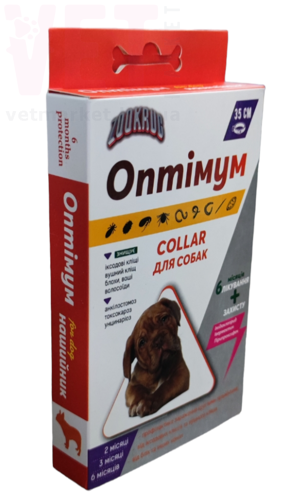 Показання до застосування: Діючі речовини, що входять до складу нашийника, мають контактну і системну протипаразитарну дію на статевозрілі та личинкові фази розвитку бліх (Ctenocephalides canis, Ctenocephalides felis), вошей (Linognathus setosus), власоїдів (Trichodectes cansus, Felic) cynotis), іксодових кліщів (Ixodidae), саркоптиформних кліщів (Оtodectes cynotis, Notoedres cati, Sarcoptes canis), тромбідиформних кліщів (Demodes spp., Cheyletiella spp.), паразитиформних кліщів (Dermacentor spp., Ixodes spp., Rhipicephalus spp.) та нематод шлунково-кишкового тракту, в т.ч. Toxocara spp., Toxascaris spp., Trichuris vulpis, Uncinaria stenocephala та Ancylostoma spp., які паразитують у собак.