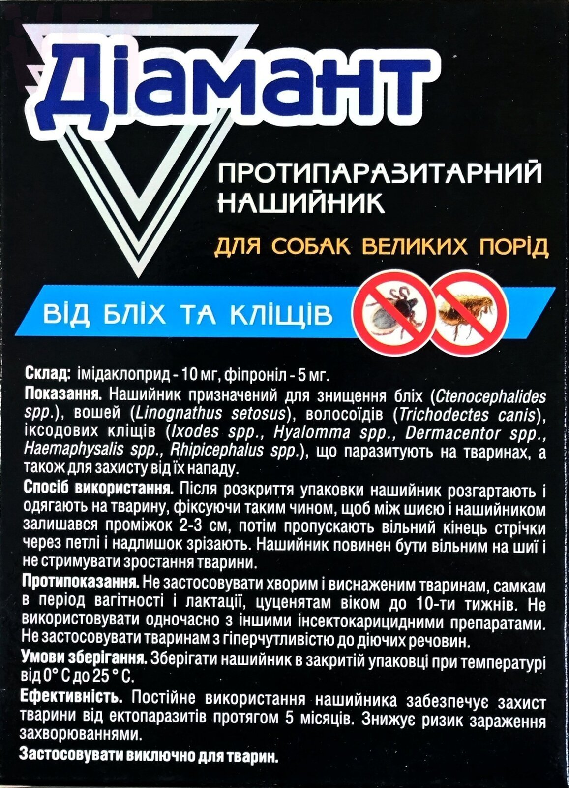 Протиопаразитарний нашийник проти бліх і кліщів. Застосовується для знищення бліх, токсичних кліщів, вошей і волосоїдів, а також для захисту тварин від їхнього нападу, що відбувається в теплу пору року (у період підвищеної діяльності паразитів).Спосіб застосування: нашийник закріпити на шию тварині таким способом, щоб між нашийником і шиєю тварини залишалося не менш ніж 2-3 см.Лишний кінець відрізати з розрахунком можливого росту тварини.Ошийник ефективний упродовж 5 місяців із початку використання.
