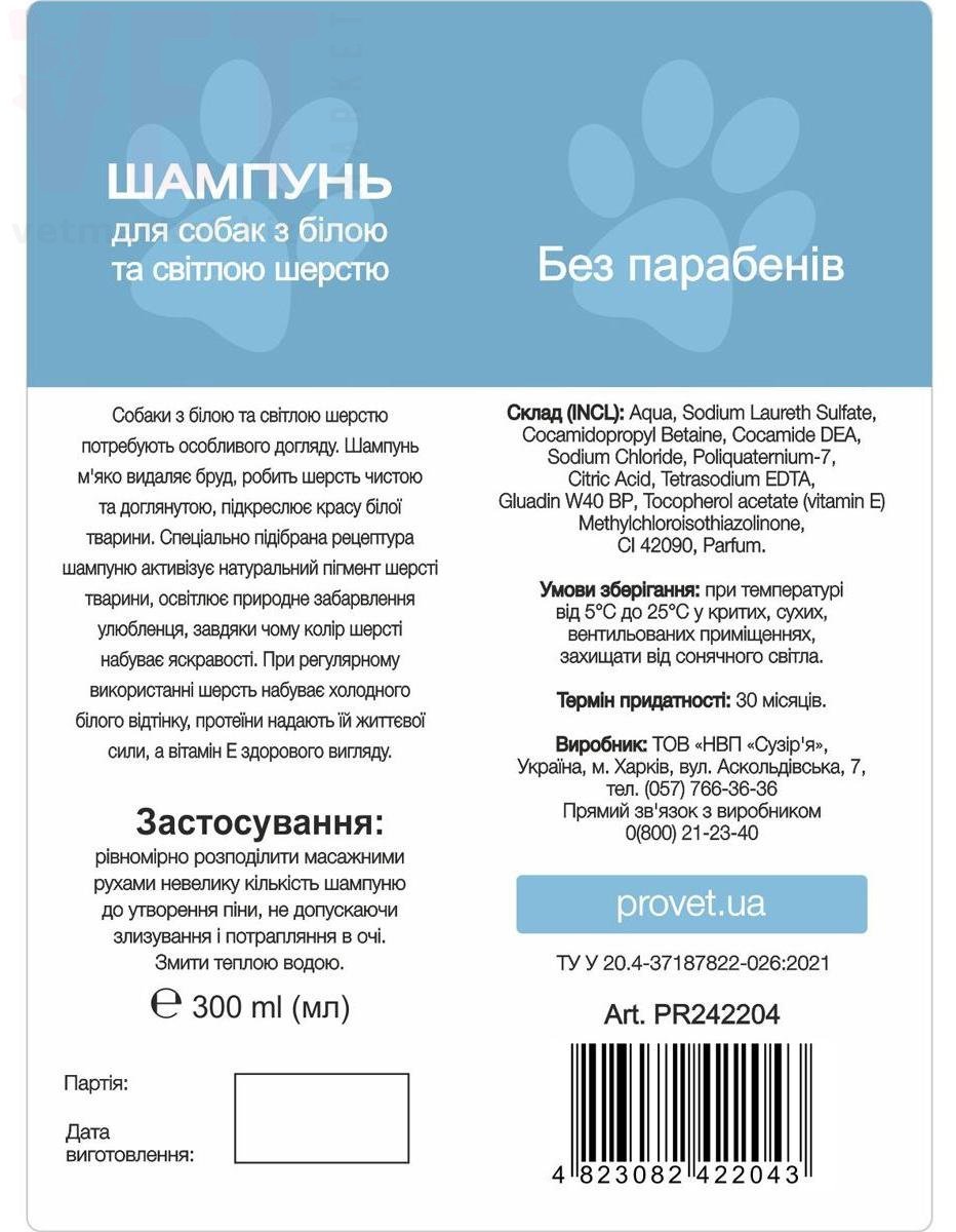 Профілайн шампунь для собак з білою та світлою шерстю, 300 мл, ProVET