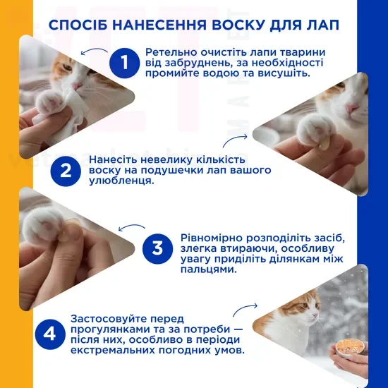 Рекомендовано для використання перед прогулянками в сніг, дощ, на гарячому асфальті або при наявності тріщин на лапах.