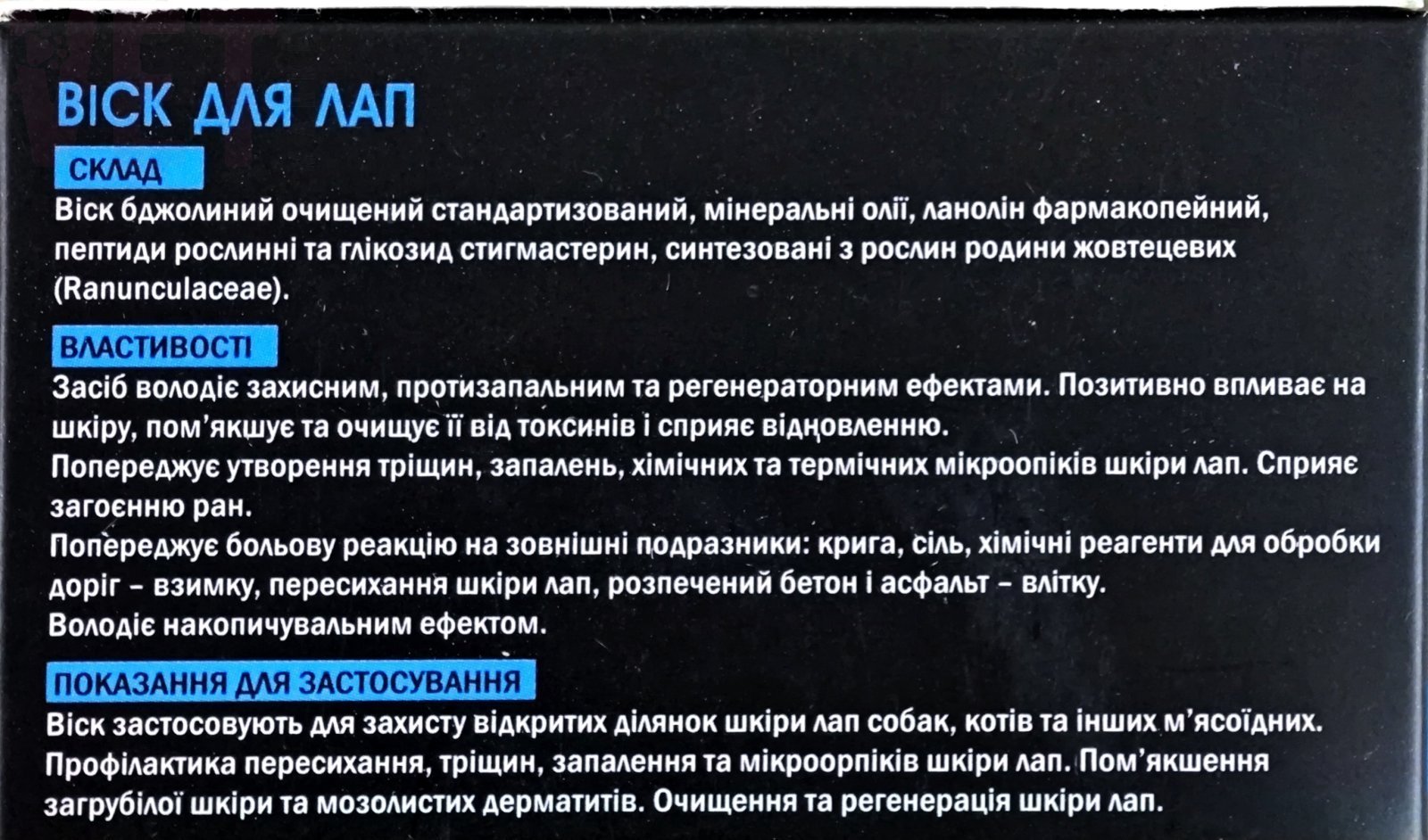 Воск специально разработан для защиты от грязи, уличной соли, а также для предотвращения повреждений подушечек лап о грубую поверхность, горячее дорожное покрытие, гравий, лед, снег и т.п.