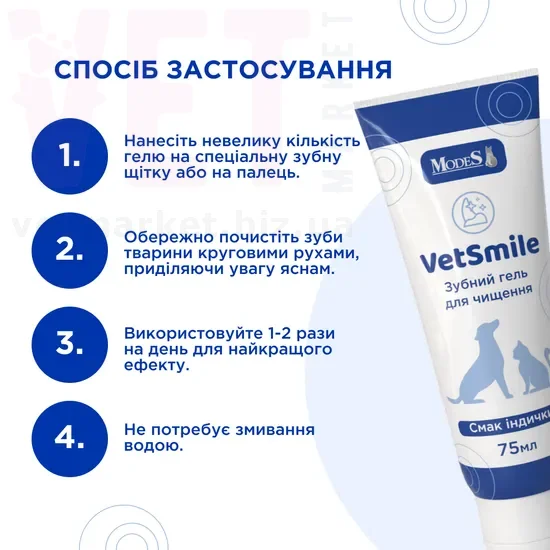 Гель VetSmile не потребує змивання, тварина може його злизувати без жодного ризику для здоров'я. Використовуйте засіб 1-2 рази на день для найкращого ефекту, або декілька разів на тиждень.