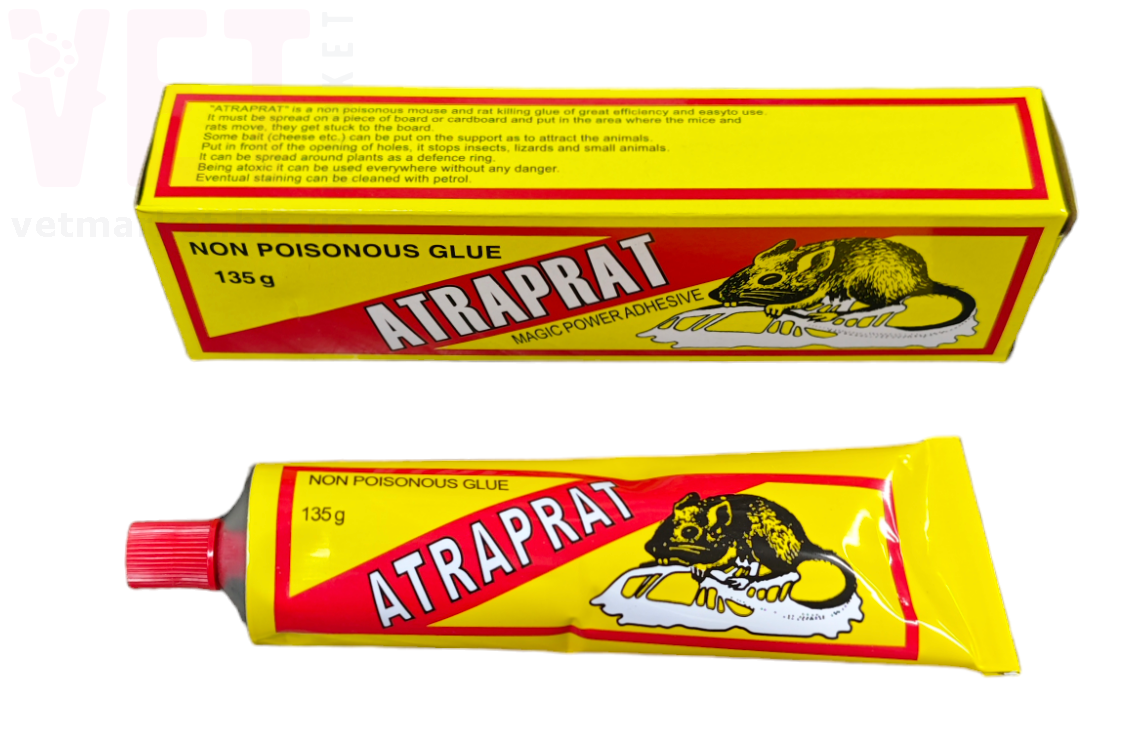 «ATRAPRAT» ("АТРАПРАТ") - нетоксичный и не ядовитый клей от грызунов (мышей, крыс) и насекомых вредителей. Обладает большой эффективностью и прост в использовании. Клей наносится на опору - кусок плотного картона или доски и помещается в область, где перемещаются мыши и крысы, насекомые-вредители; они застревают и приклеиваются к доске или картону.