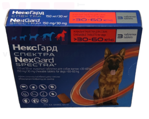 Нексгард Спектра (NexGard Spectra) 30-60 кг (XL) таблетка от блох, глистов и клещей 3 таблетки. НексгарД Спектра – комбинация двух действующих веществ, активных против наиболее распространенных внешних и внутренних паразитов собак. Новая вкусная жевательная таблетка для собак – следующее поколение Фронтлайн НексгарД, направленного на защиту против блох и клещей. НексгарД Спектра помимо действия на внешних паразитов, борется против гельминтов - аскарид, власоглавов и анкилостом, а также направлен на защиту собак от дирофиляриоза. Таблетки, созданные на основе соевого протеина со вкусом и запахом говядины, в большинстве случаев с удовольствием поедаются собаками. Поскольку таблетки производятся на растительной основе, не вызывают аллергию на животные белки.