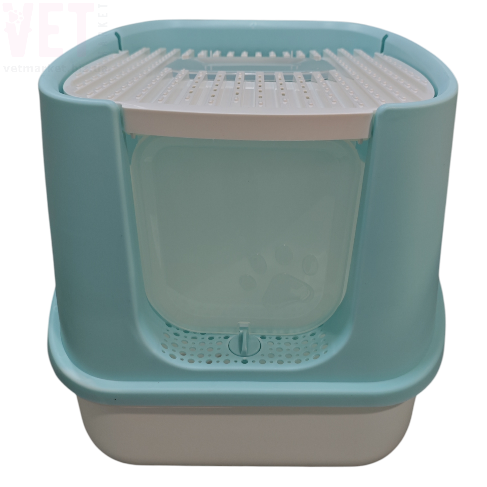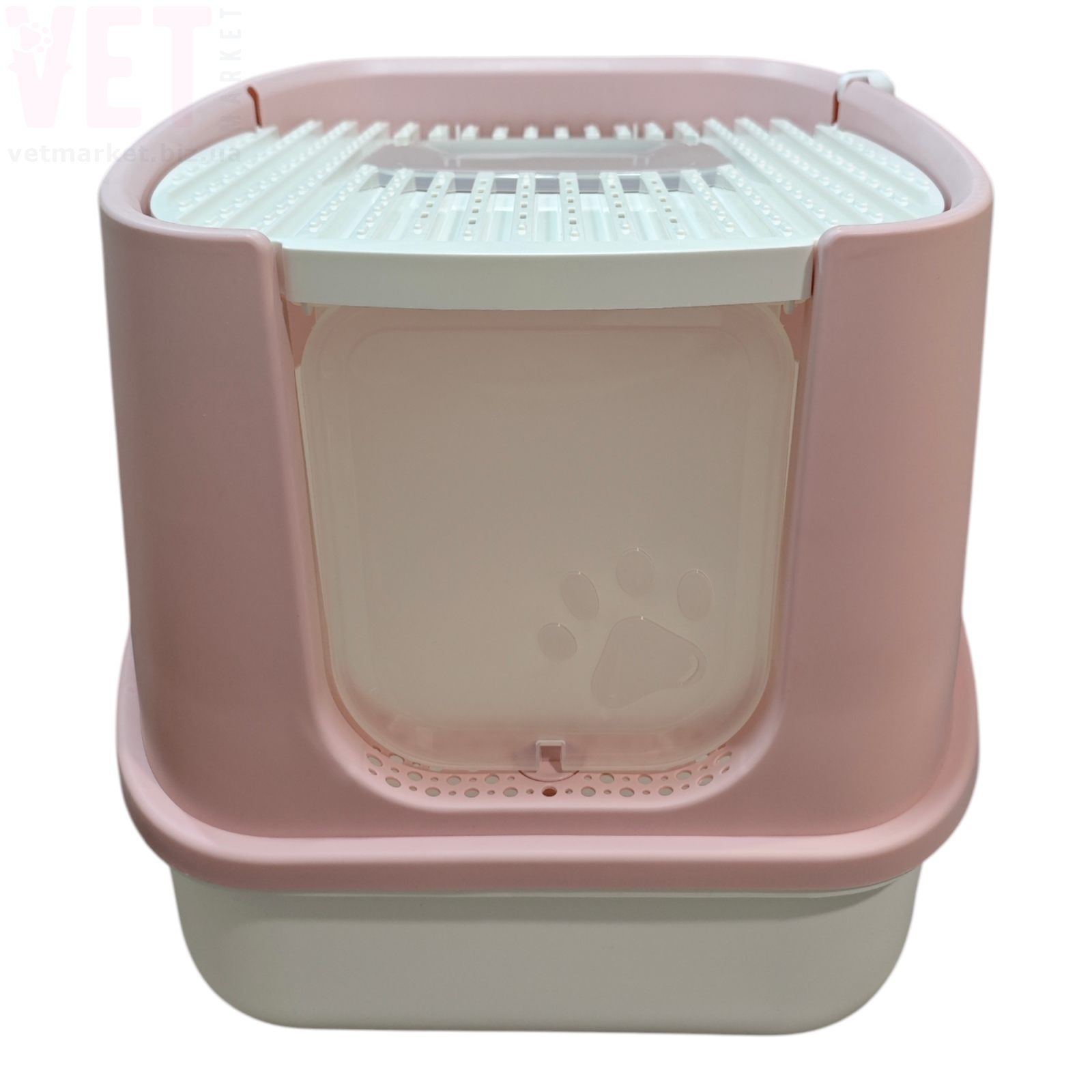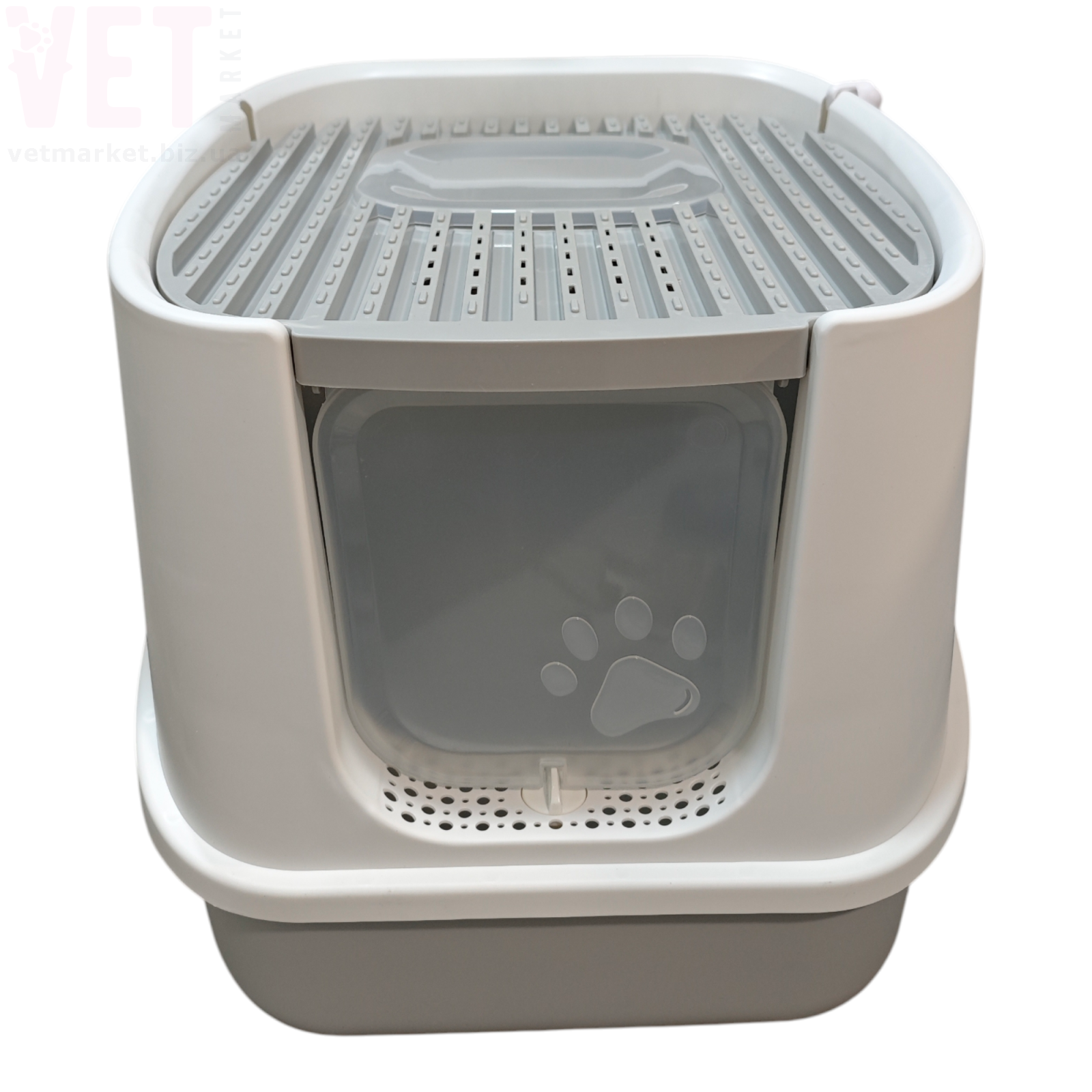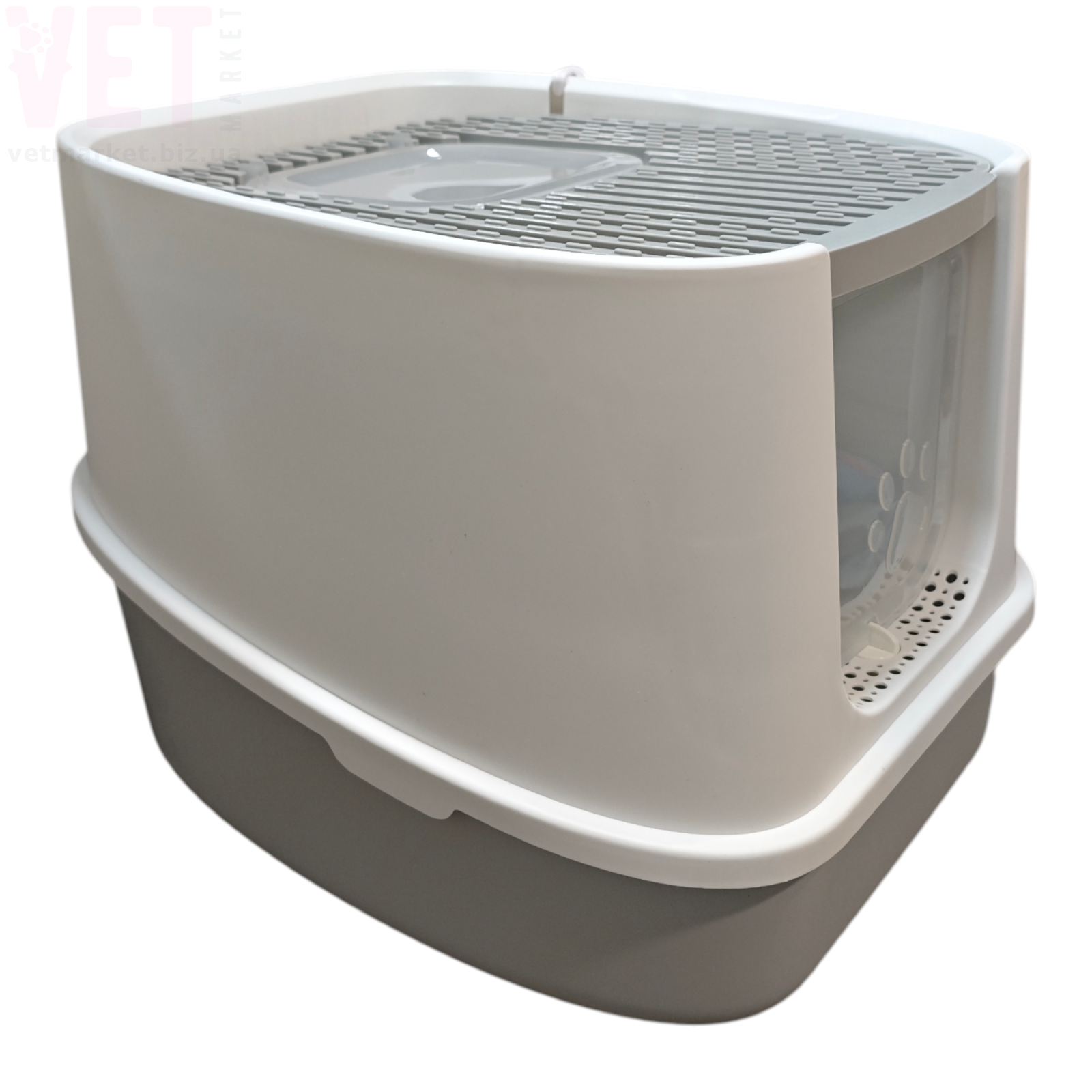 Туалет оснащений зручними прозорими дверцятами, які легко відкриваються та закриваються. Верхня решітка допомагає очищати лапки кота від залишків наповнювача. Конструкція легко розбирається, що значно спрощує миття та догляд.