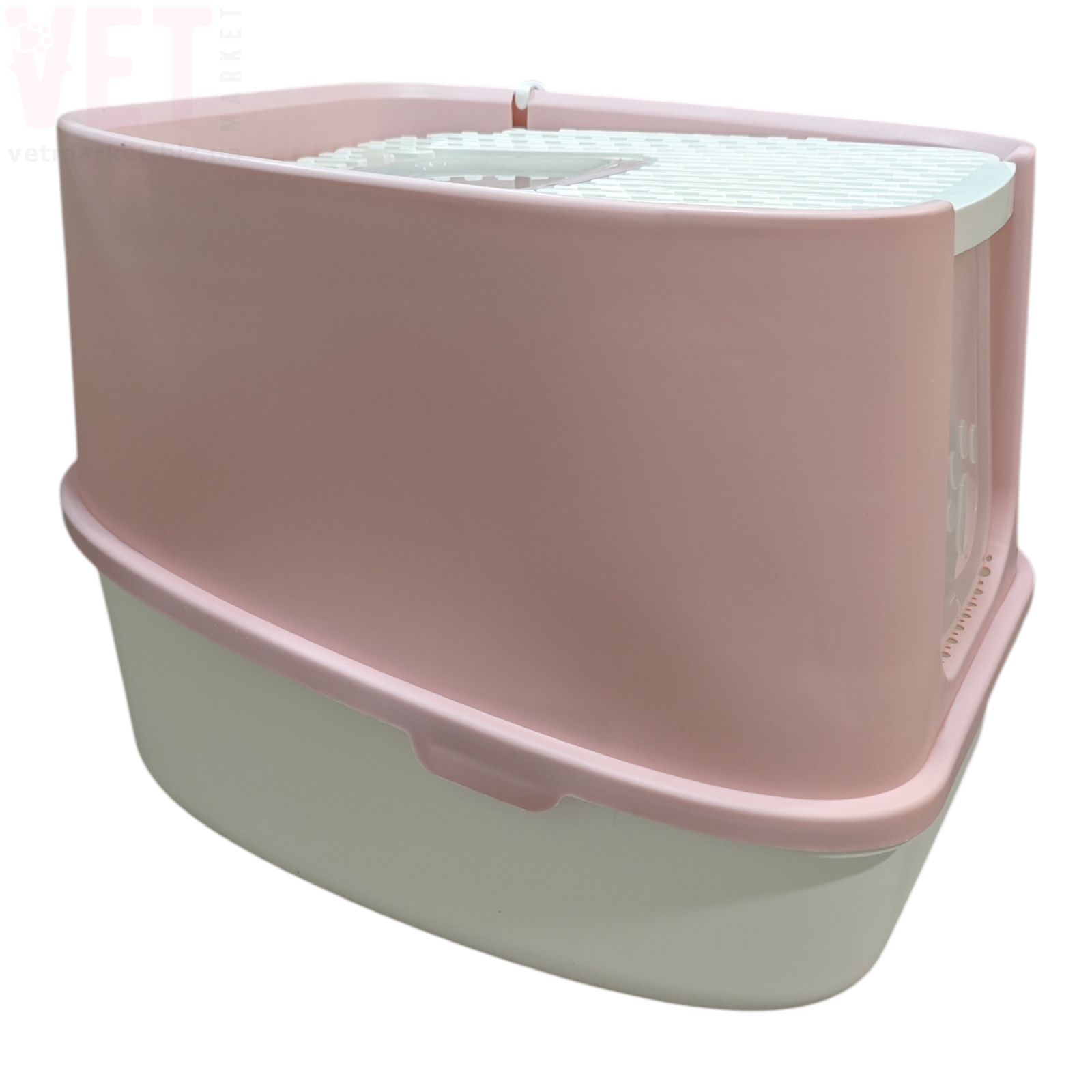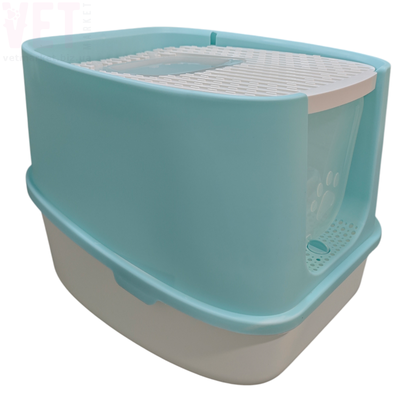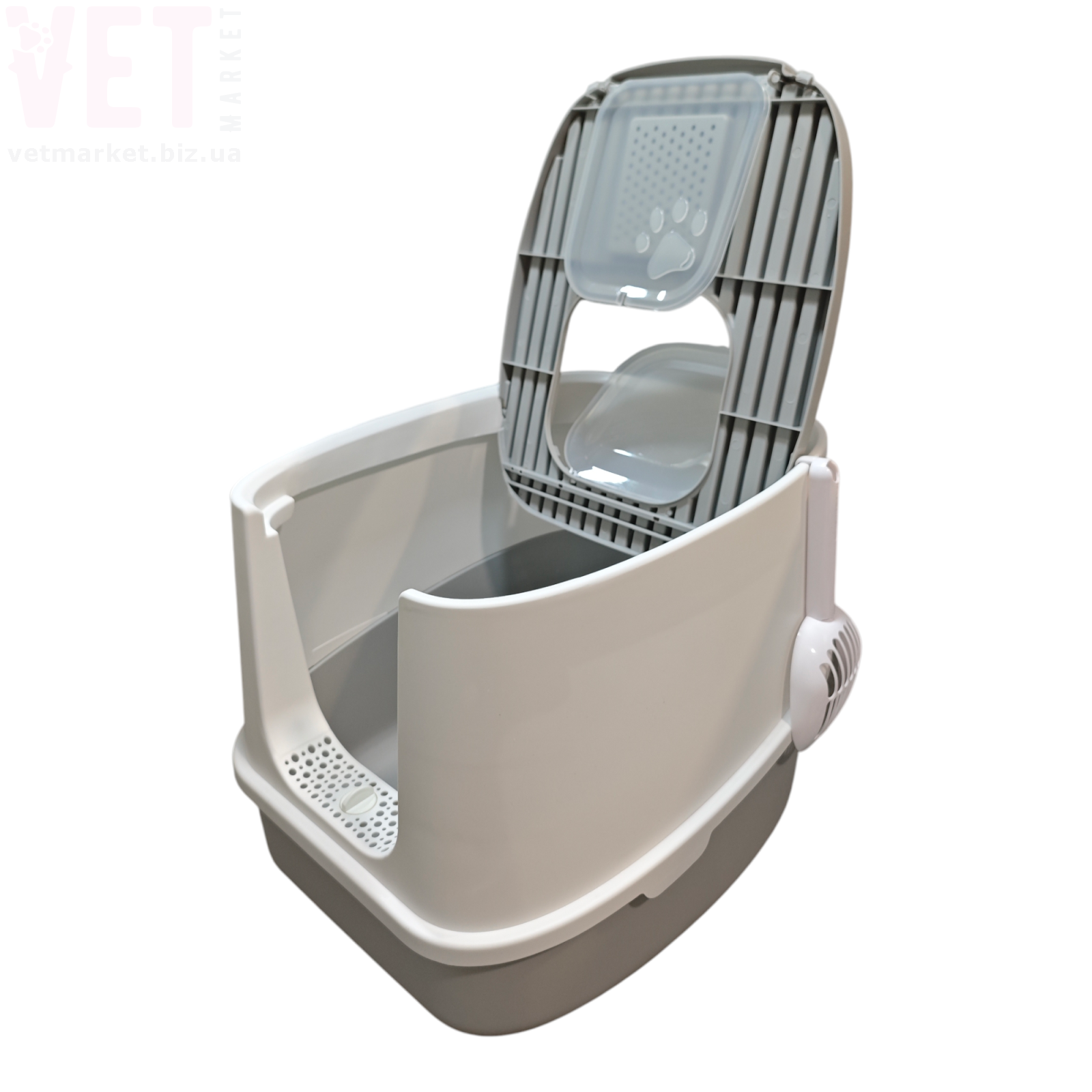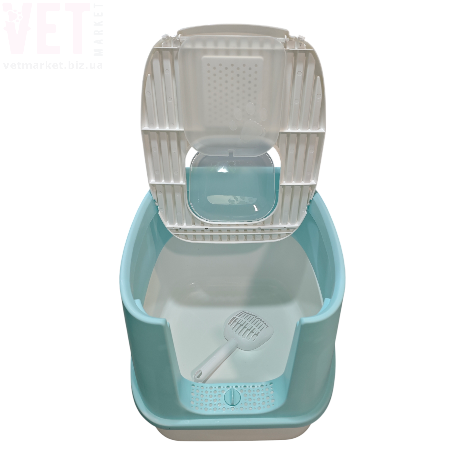 Туалет оснащений зручними прозорими дверцятами, які легко відкриваються та закриваються. Верхня решітка допомагає очищати лапки кота від залишків наповнювача. Конструкція легко розбирається, що значно спрощує миття та догляд.