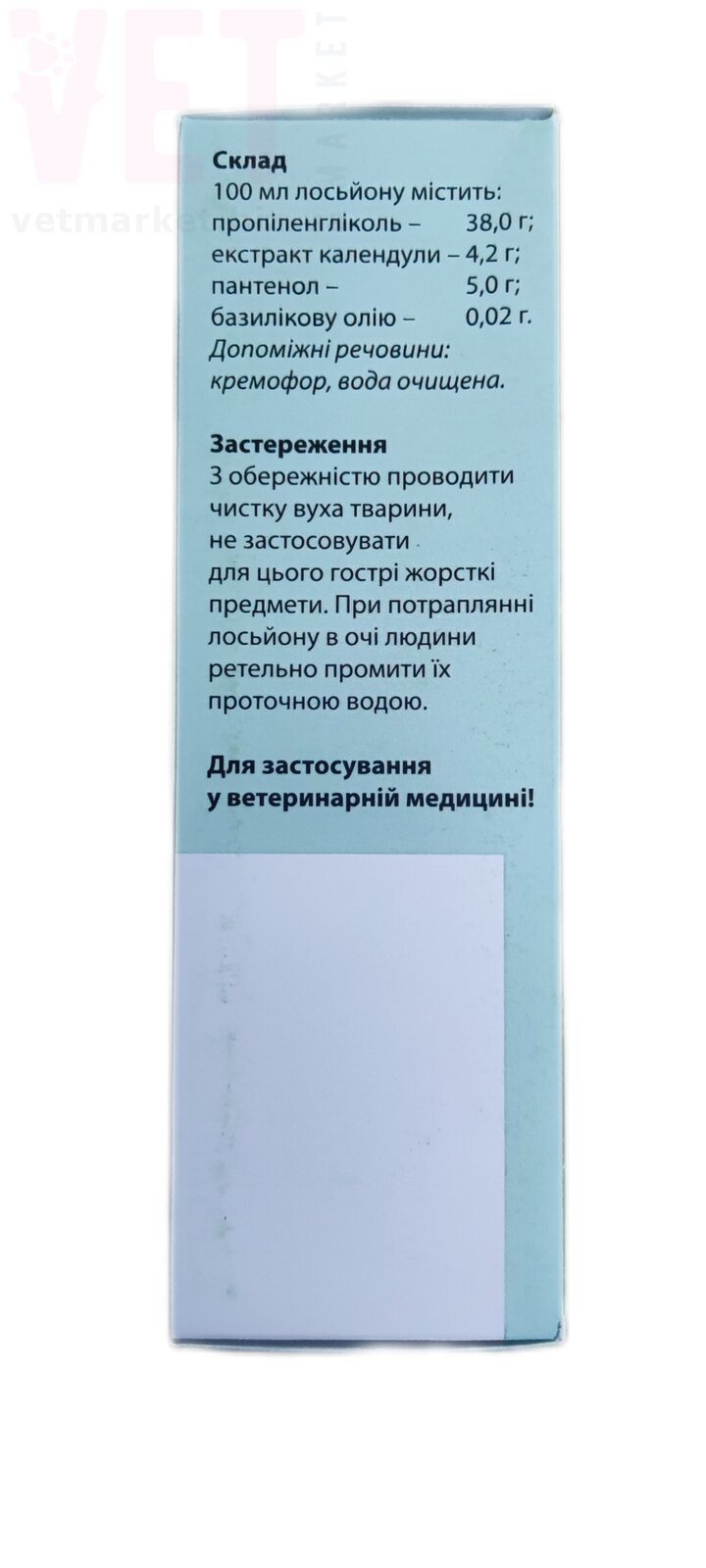 Увлажняющее, церуминолитическое и очищающее средство для ухода за кожей наружного слухового прохода животных, в том числе при наружных отитах, дерматитах различной этиологии, для регулярного ухода и профилактики.