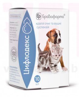 Лечение собак, котов, мелких экзотических и декоративных животных (декоративных кроликов, хомяков, крыс, мышей, морских свинок, попугаев, рептилий) при острых и хронических воспалениях глаз и ушей, которые являются следствием бактериального, химического или травматического воздействия — конъюнктивит, блефарит, кератит, кератоконъюнктивит, иридит, иридоциклит, язвы и эрозии роговицы, заболевания глаз после травм, попадания инородных тел или агрессивных соединений, в пред- и послеоперационные периоды, а также отит, оторея, в частности вызванные сторонним вмешательством.