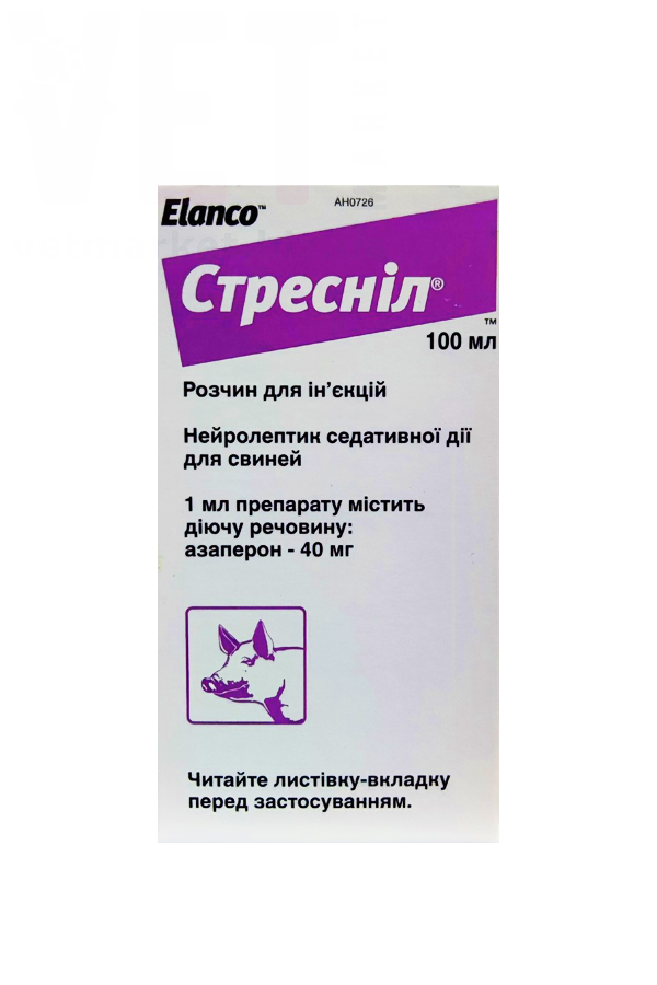 Стреснил относится к группе нейролептических лекарственных средств. Азаперон, входящий в состав лекарственного средства, принадлежит к группе бутирофенонов, оказывает сильное, но непродолжительное седативное действие, анксиолитический эффект проявляется из-за воздействия на 5НТ-рецепторы (серотониновые рецепторы). В рекомендуемых дозах азаперон блокирует альфа-рецепторы, ингибирует моторные импульсы, при этом сенсорные реакции (обоняние, вкус) сохраняются. Стреснил оказывает успокаивающее действие, степень покоя и длительность действия зависят от вводимой дозы: при введении препарата в низких дозах (0,5 мг/кг массы по ДВ) животное успокаивается, становится управляемым, при введении более высокой дозы (2 мг/кг массы по ДВ) животное.