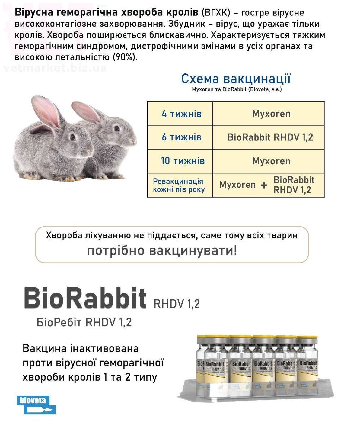 міксоматозу кролів «Міксорен», виробництва АТ «Біовета». Вакцини можна змішувати або вводити в різні ділянки одночасне.