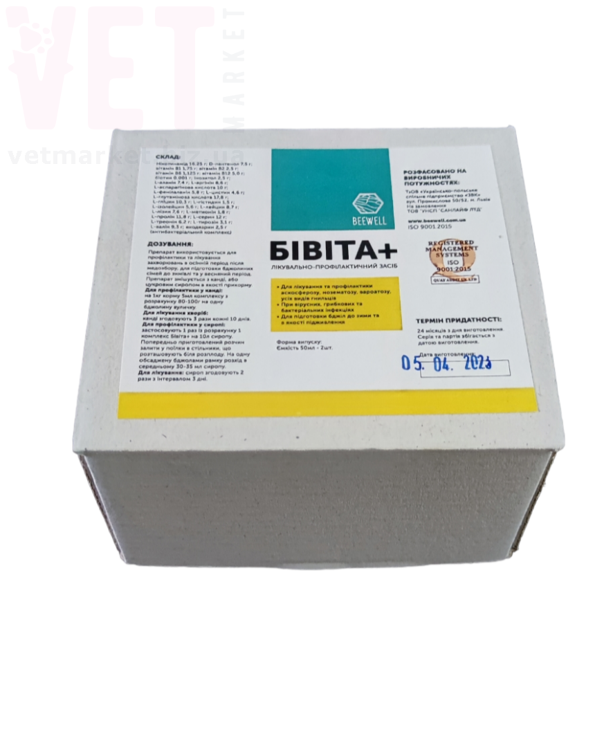 Препарат використовується для профілактики та лікування захворювань в осінній період після медозбору, для підготовки пчелиних сімей до зимівлі, та у весняний період. Препарат змішується з канді або сахарним сиропом як прикорм. Для профілактики у канді: на 1 кг корму 5 мл комплексу, з розрахунку 80-100 г на одну пчелину вуличку. Для лікування у канді: згодовують 3 рази кожні 10 днів. Для профілактики у сиропі: застосовують один раз із розрахунку 1 комплекс Бівіта+ на 10 л сиропу. Заздалегідь приготований розчин залити у поїлки в соти, які розміщують біля розплоду. На одну обсаджену пчелами рамку розхід у середньому 30-35 мл сиропу. Для лікування у сиропі: згодовують 2 рази з інтервалом 3 дні.