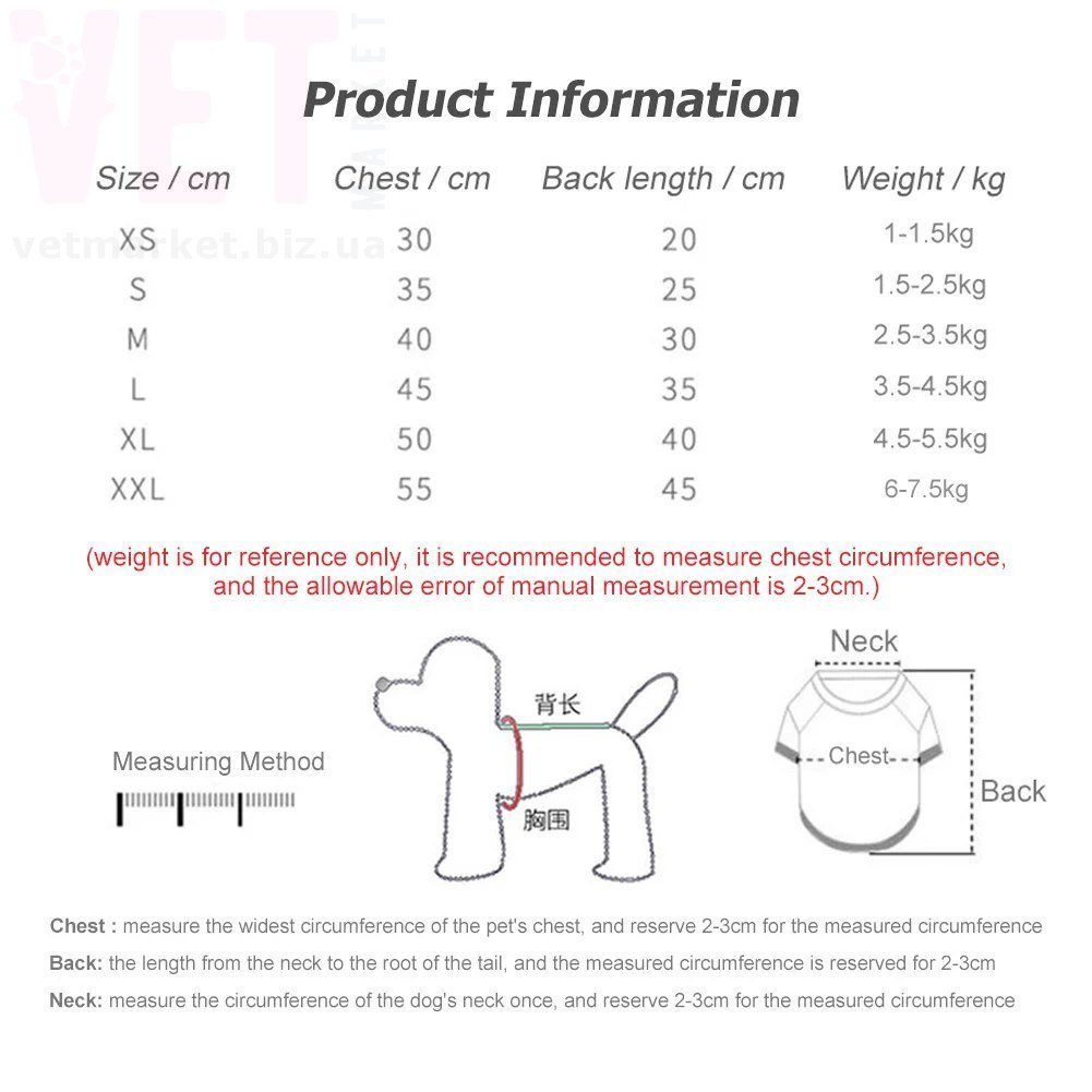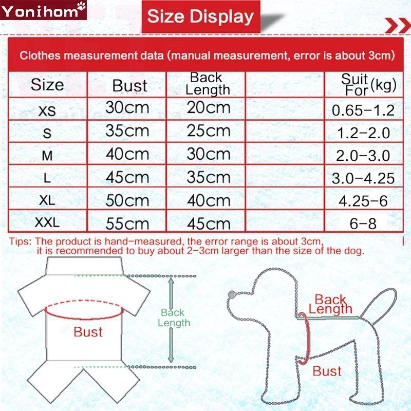 1. Пожалуйста, проверьте размеры вашего питомца, чтобы убедиться, что одежда подходит для домашних животных перед заказом (1 дюйм = 2,54 см)